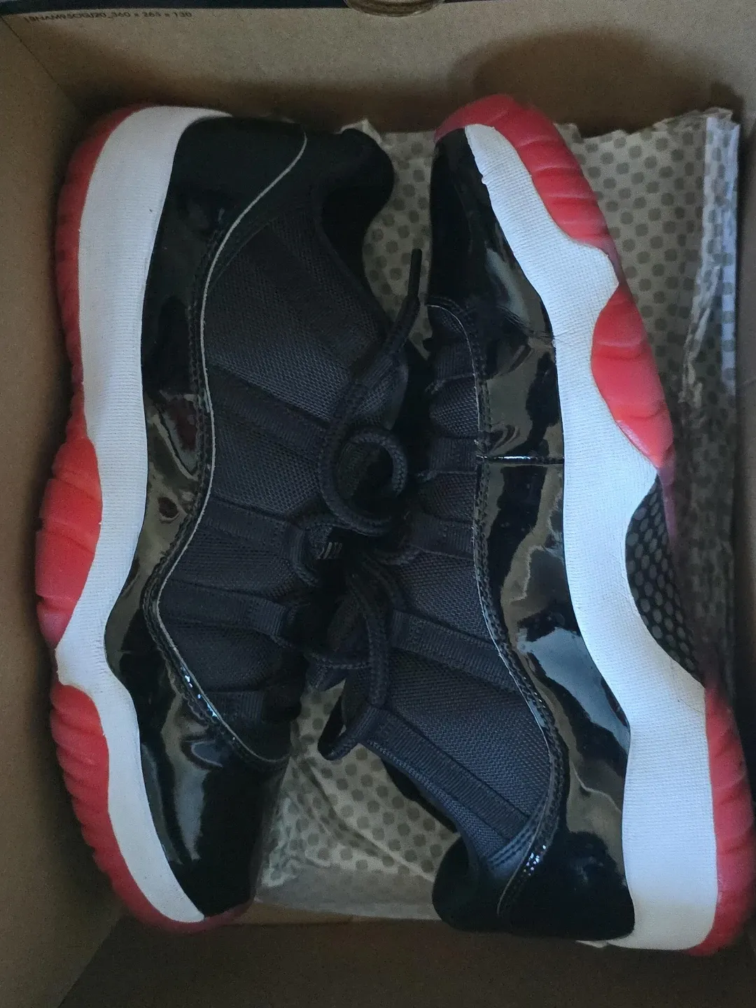 These are Air Jordan 11 Retro sneakers in black and red. They feature a patent leather and mesh upper with a white midsole and red outsole. Includes original box.