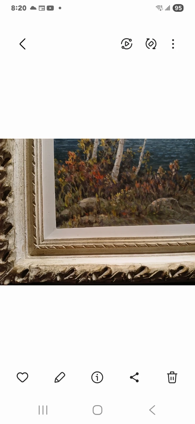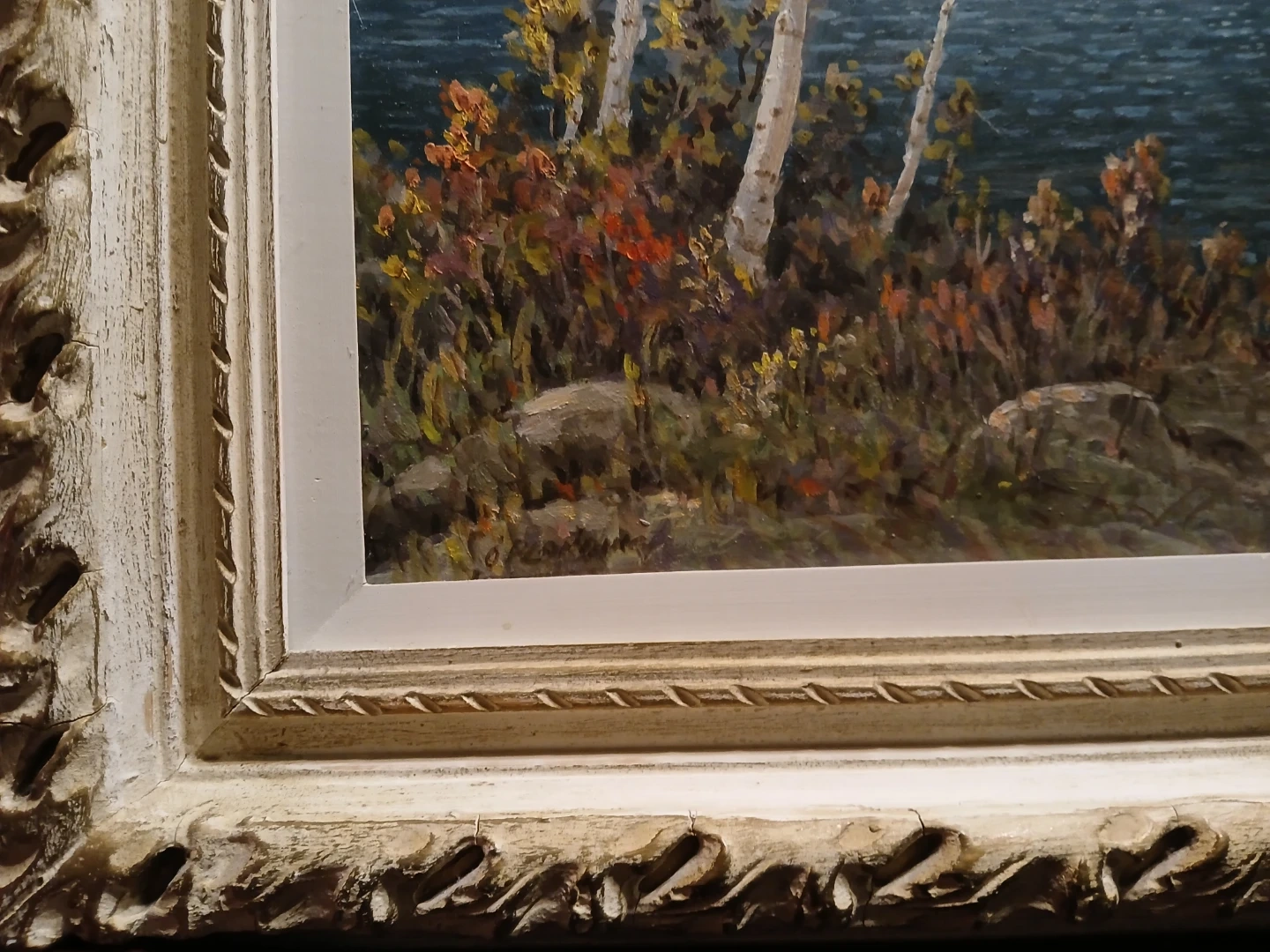 This framed painting depicts a serene lakeside scene in autumn. It features vibrant fall foliage and birch trees reflected in the calm water. The artwork is housed in an ornate, textured frame, ready to enhance any room's decor.