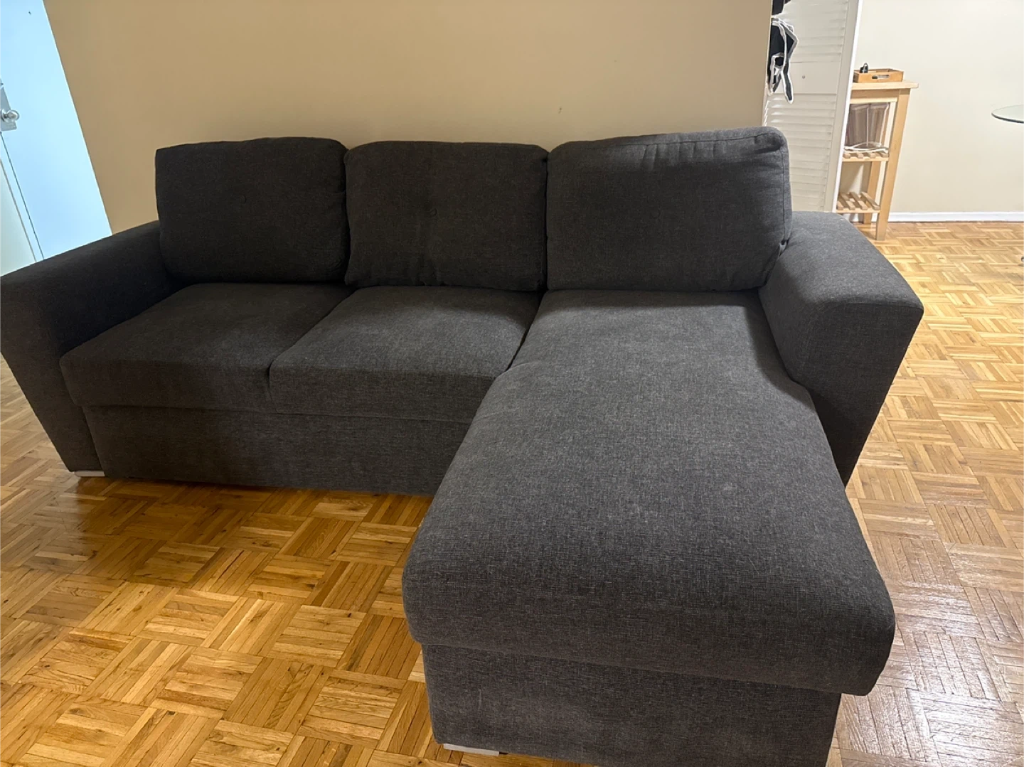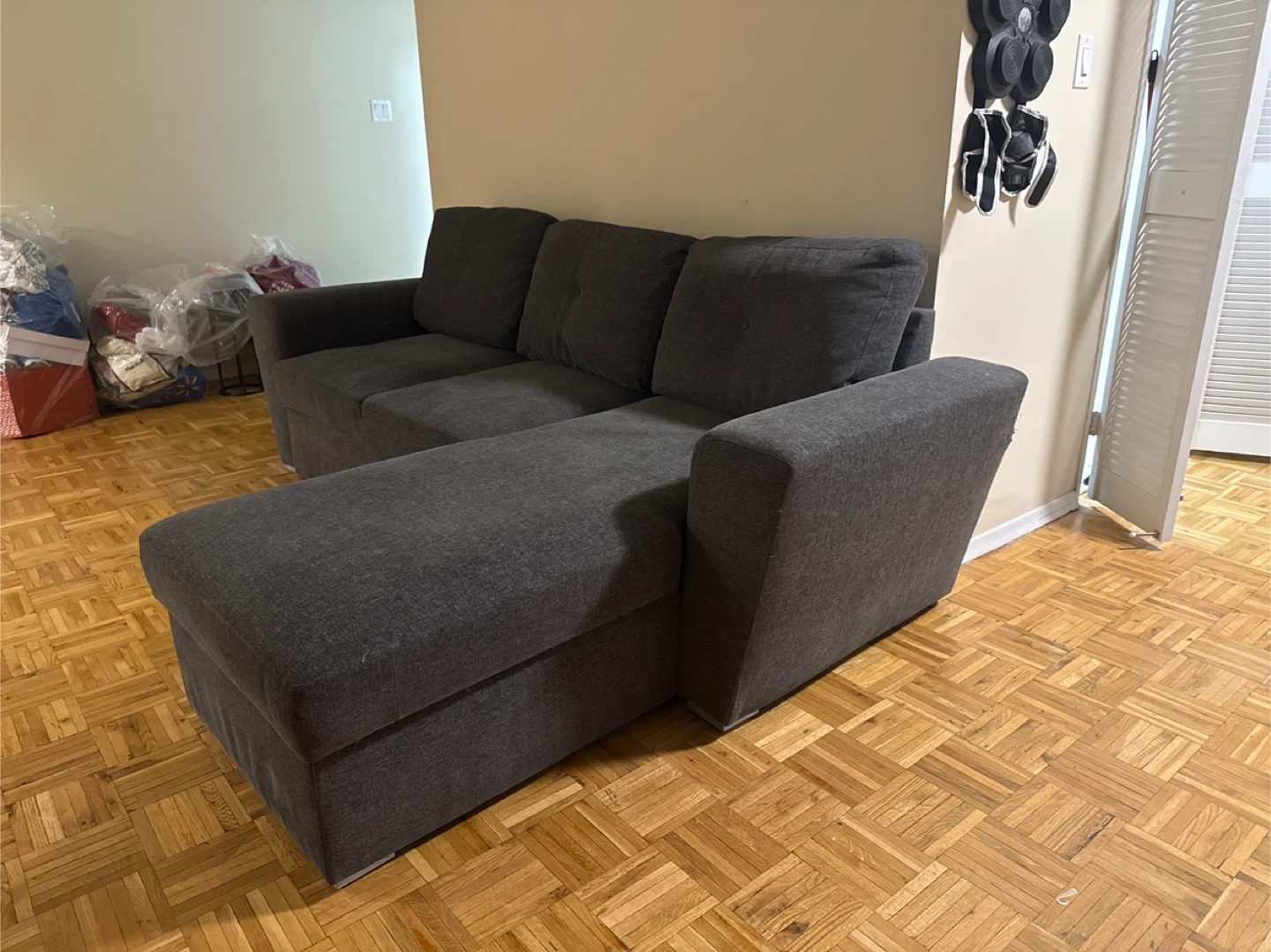 Three-seat sectional sofa in a dark grey fabric. Offers ample seating space. Its chaise lounge can be positioned on either side.