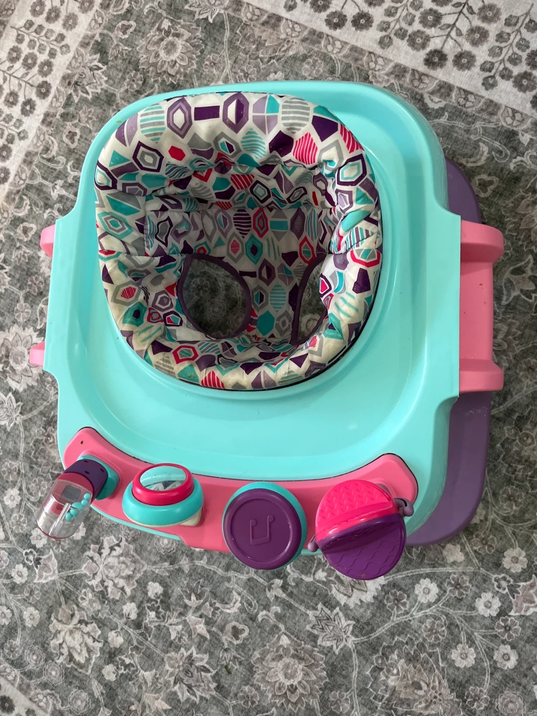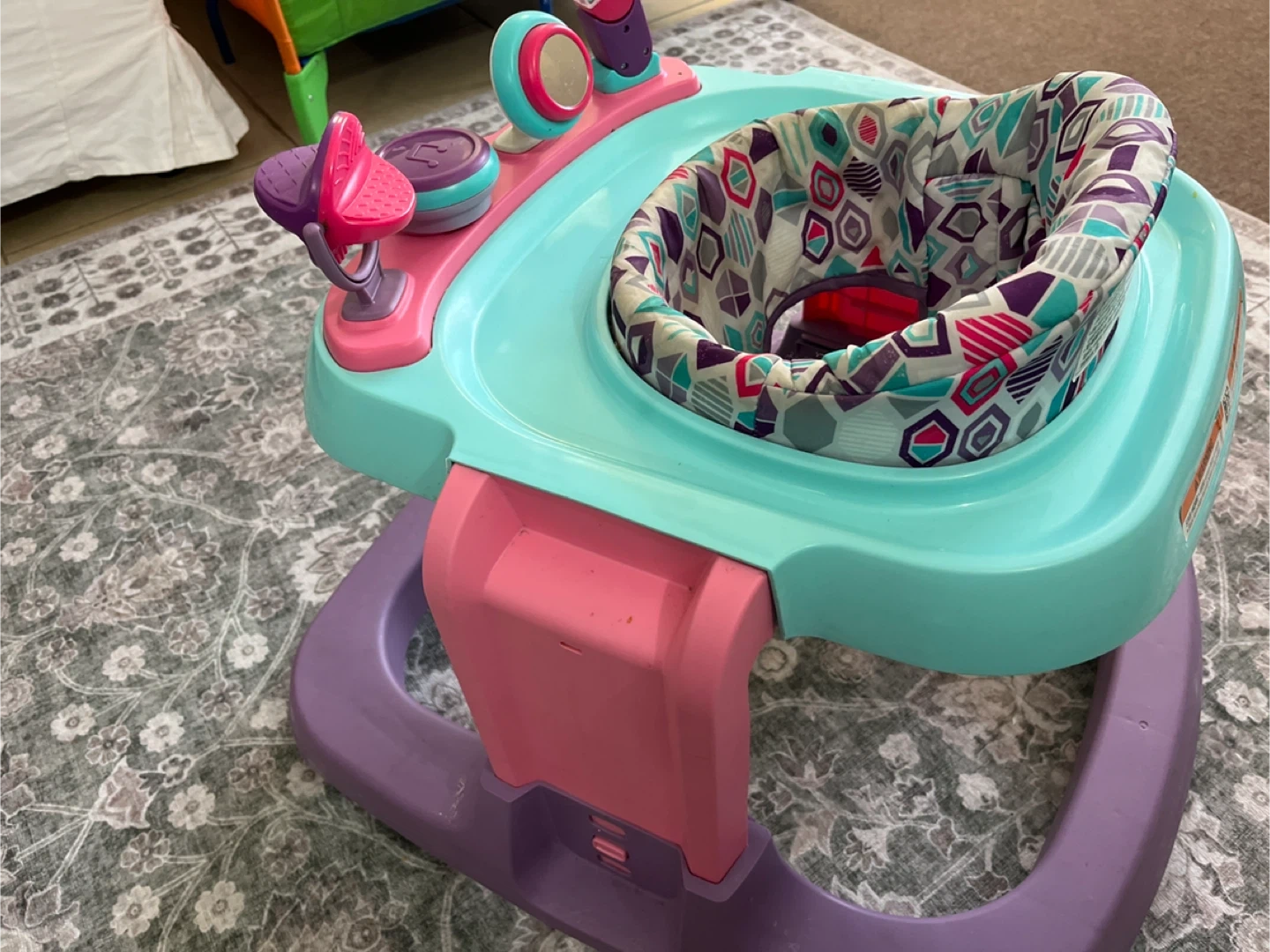This Safety 1st baby walker has a colourful padded seat and engaging play tray with toys. It's designed to help little ones explore their surroundings. Perfect for babies learning to walk and explore!