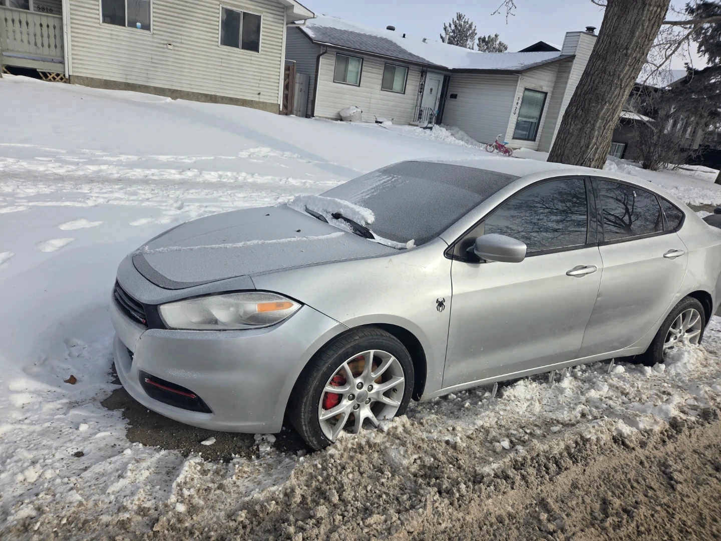 This is a silver Dodge Dart sedan. It's a four-door car with a clean interior, featuring fabric seats and a functional dashboard. Perfect for navigating city streets or for daily commutes.it needs battery to Start only.200.000km manual