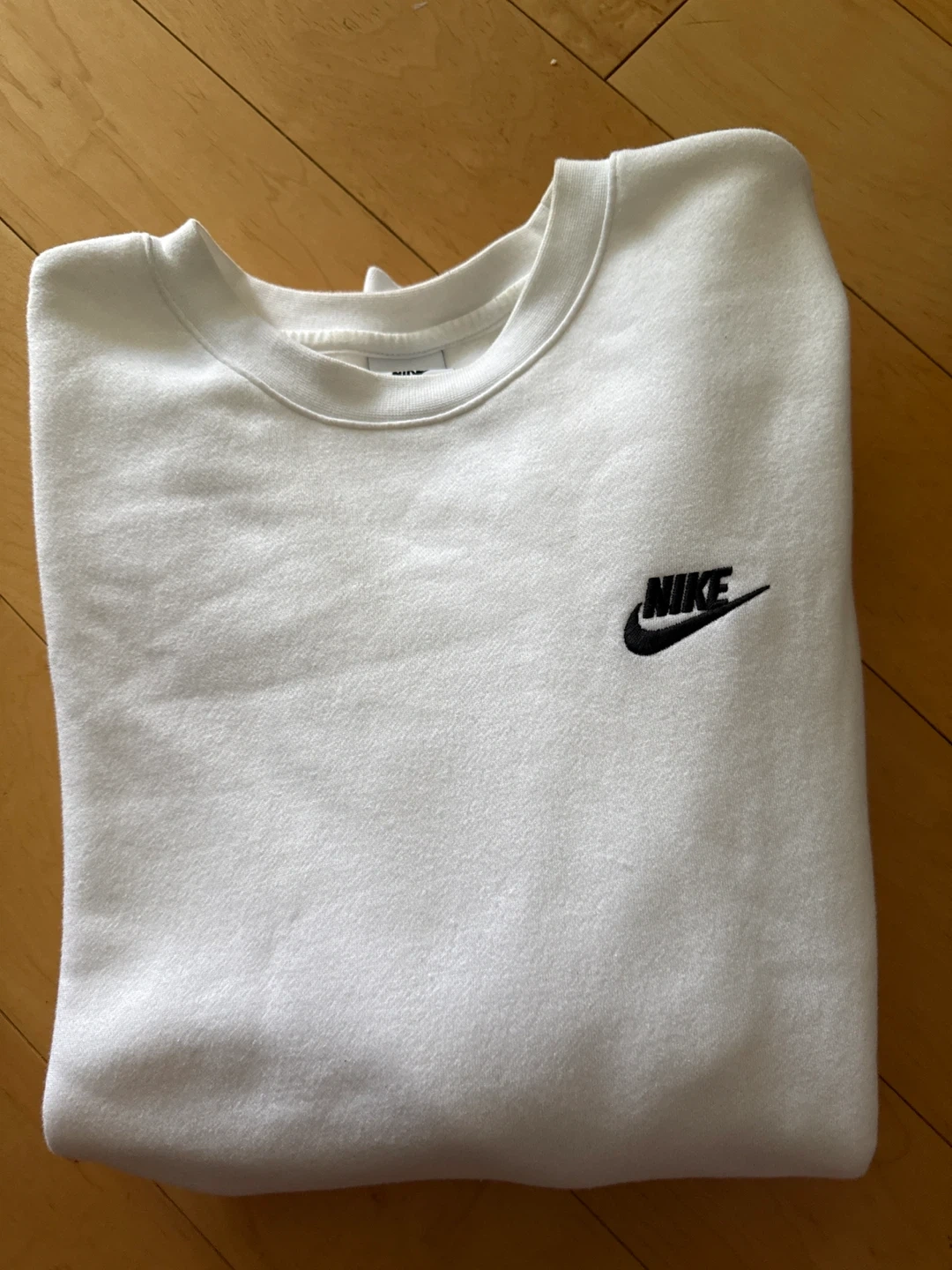 White Nike crewneck sweatshirt. Features the classic Nike Swoosh logo. Made in Jordan.
