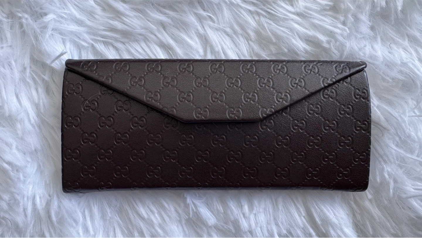 Gucci hard shell glasses case in a rich brown hue. Features the iconic GG monogram embossed throughout. It's perfect for protecting your sunglasses or eyeglasses in style!