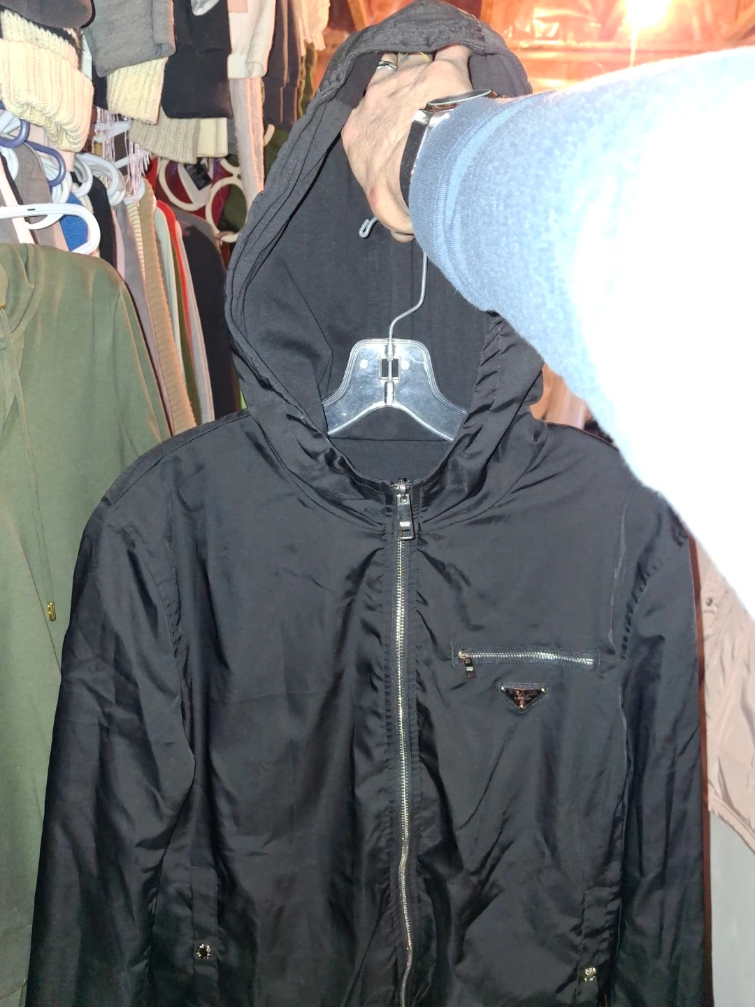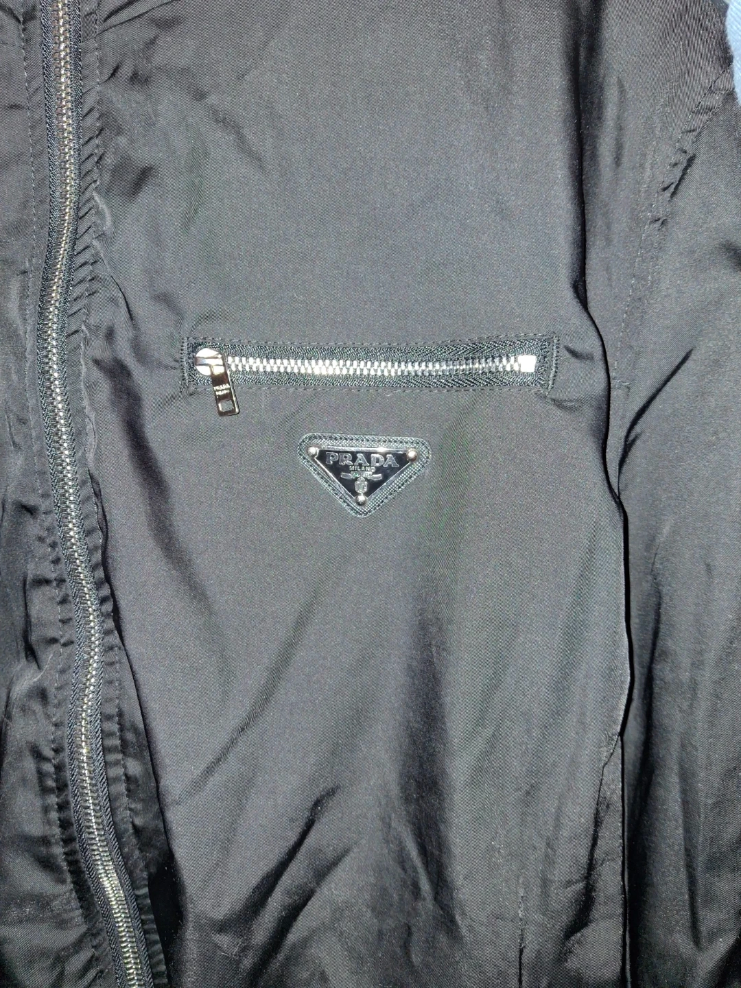 This is a stylish black Prada jacket featuring a zip-up front and a convenient chest pocket. It also includes a hood for added versatility. Made from durable material, it's ready for everyday wear.