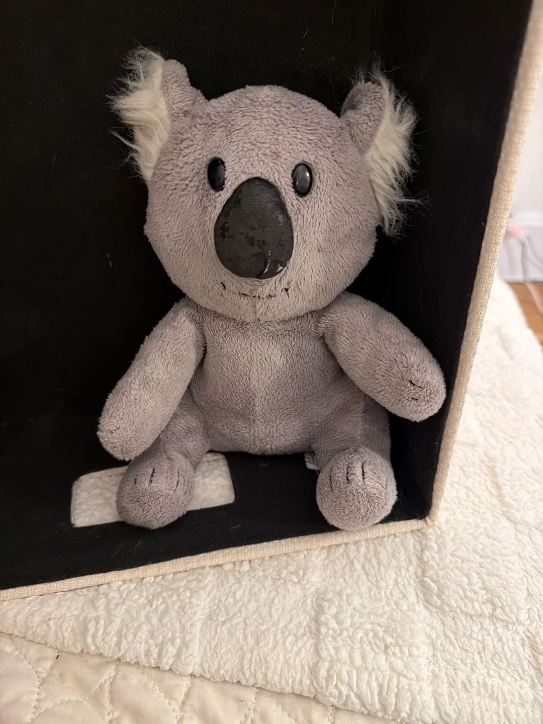 This is a soft, gray plush koala stuffed animal. It has black button eyes and a black nose. The fur is soft and cuddly. It's a sweet toy for a child!