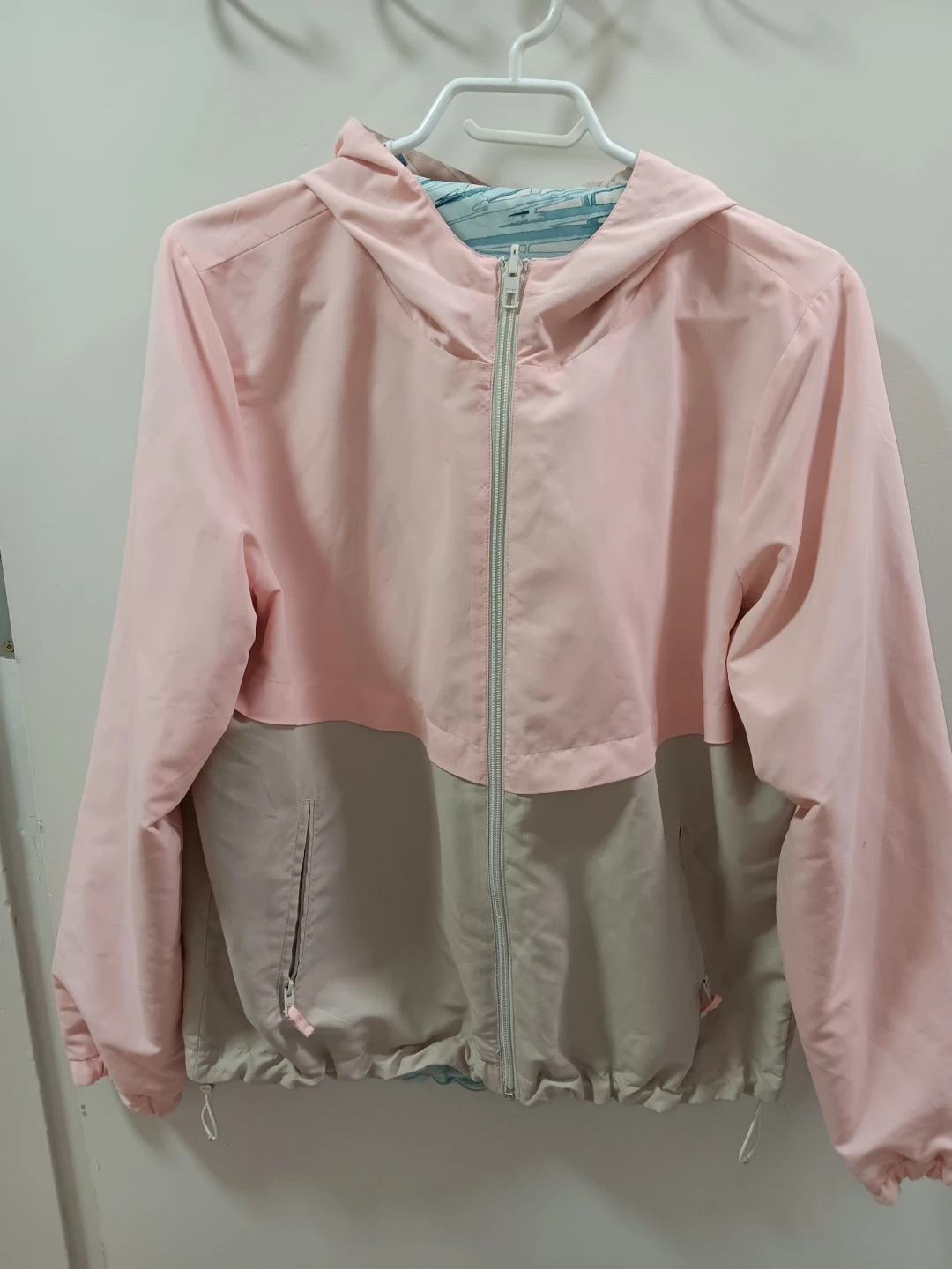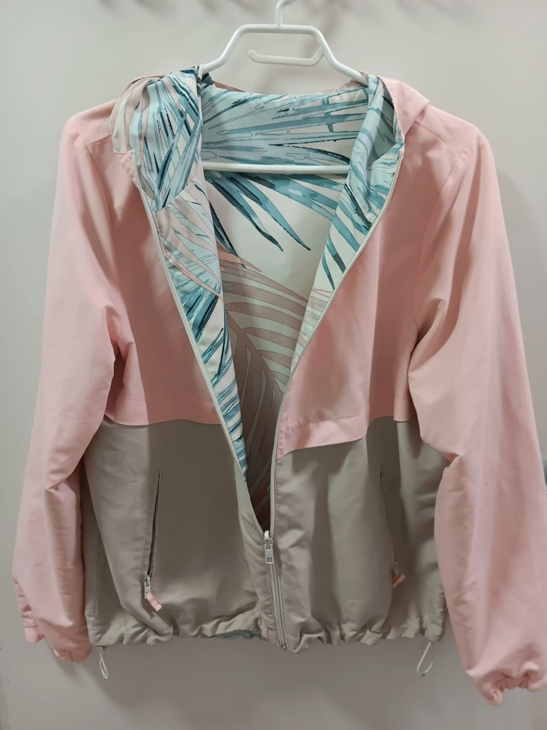 This reversible hooded jacket features a pink and grey colour-block design on one side and a vibrant tropical leaf print on the other. It's lightweight and perfect for breezy days! Features a full zip closure and adjustable drawstring hem. BNWOT and is in pristine condition. Size XL or an intentionally loose fitting size Large!