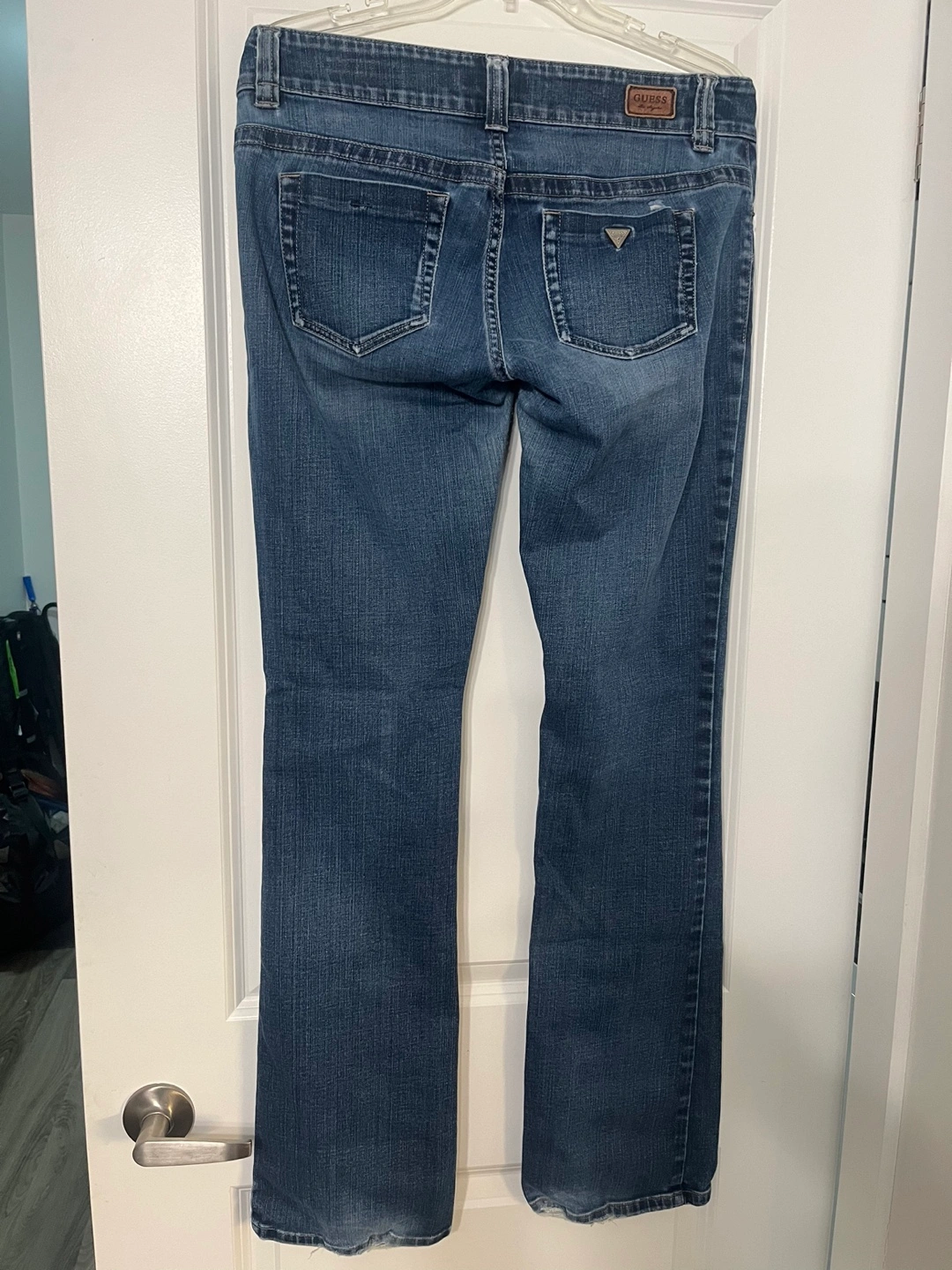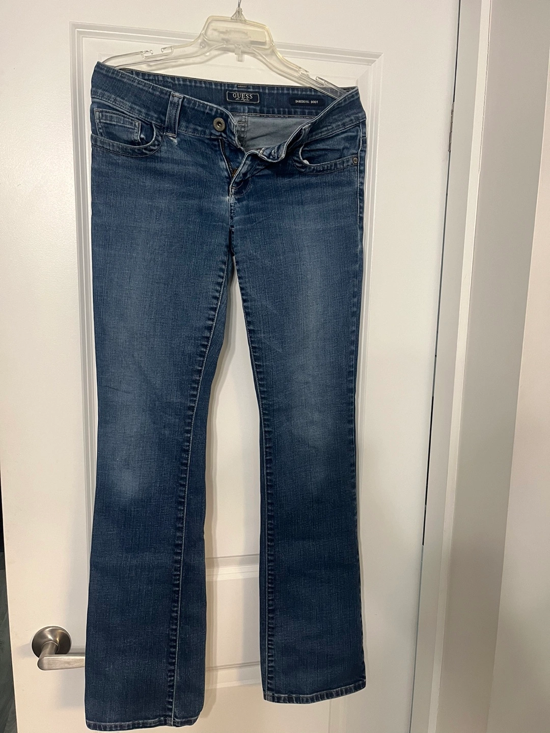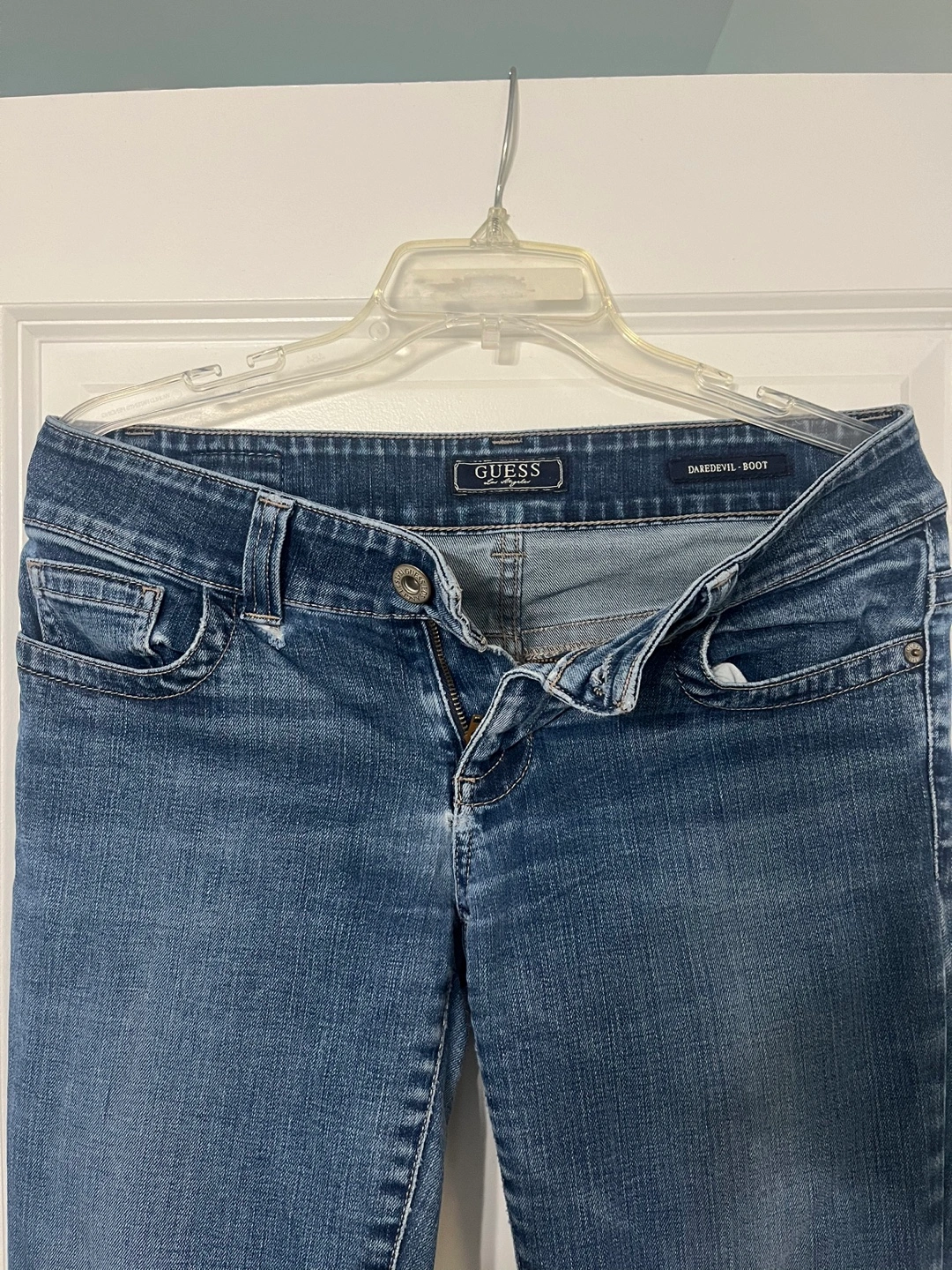 Guess Daredevil Bootcut Jeans These jeans are a dark wash colour. Features include front and back pockets, a button and zipper closure, and a bootcut leg. A great piece for any wardrobe that offers both comfort and style.