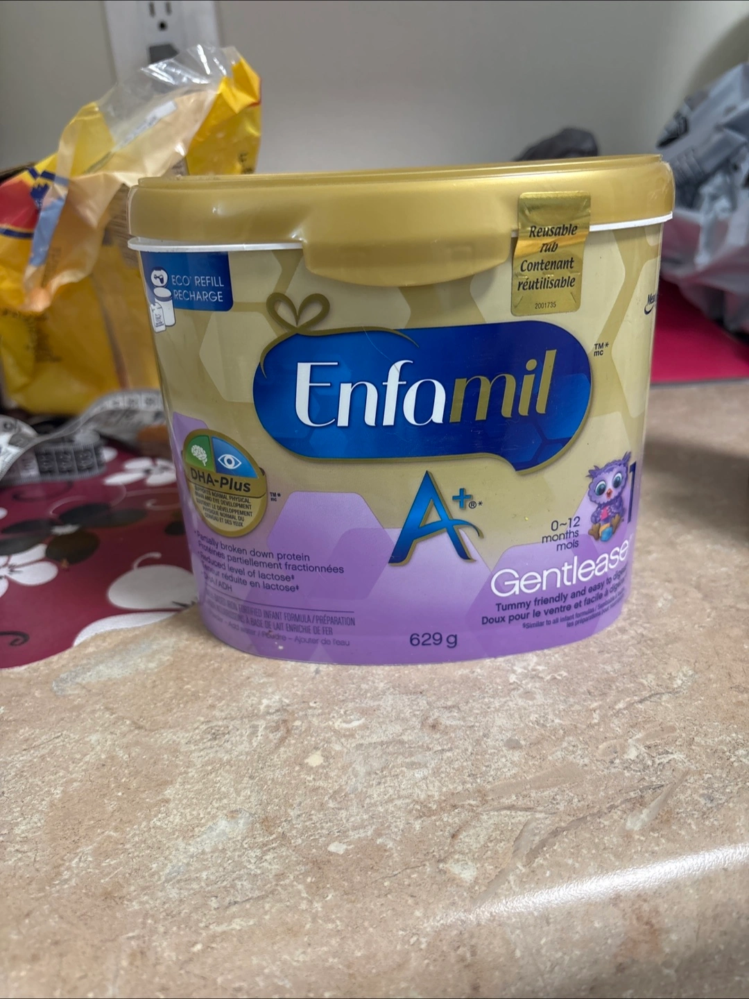 225A tub of infant formula. Contains DHA-Plus. The label indicates 0-12 months. Consider this for a peaceful feeding time.