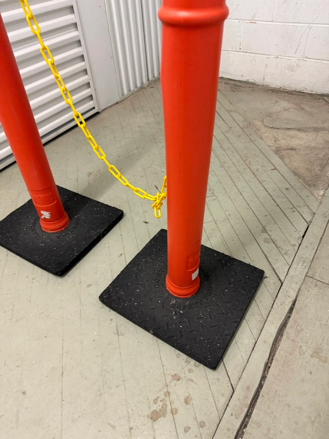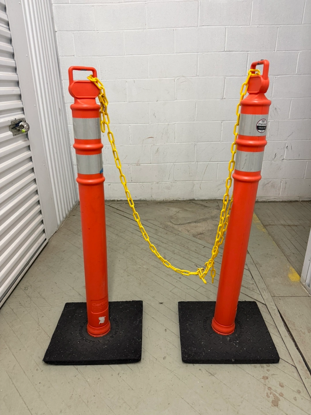 I am selling two orange safety posts. They are connected by a yellow chain and feature reflective strips. The posts sit on black square bases. Consider these posts for a neat and safe work area.