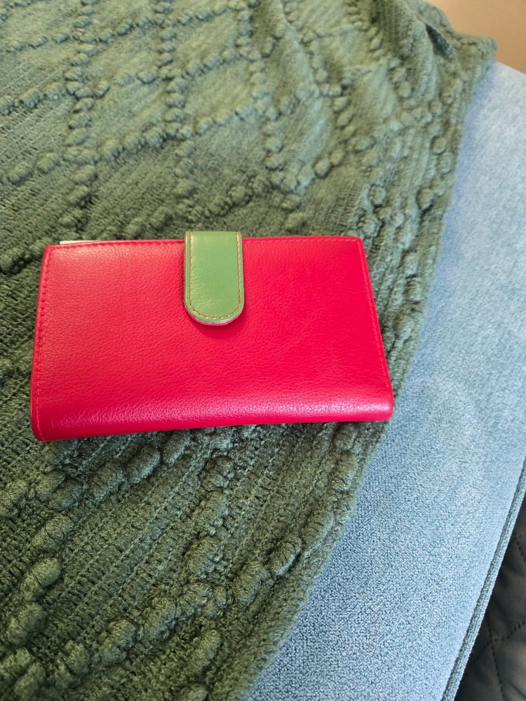 Wallet in red and blue colors. Interior includes multiple card slots, and a zippered pocket. You can use this lovely wallet to keep your important belongings organized and safe.