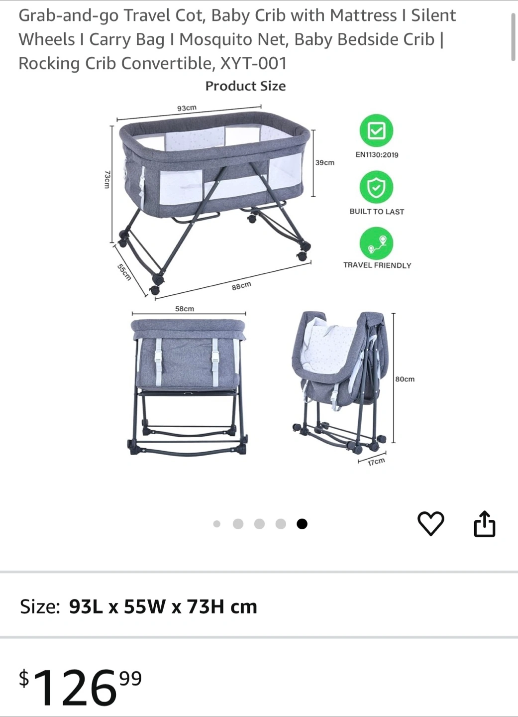 A portable baby bassinet with mattress. Features a grey exterior and a white interior. Has a mesh siding. Great for a baby to sleep soundly in.