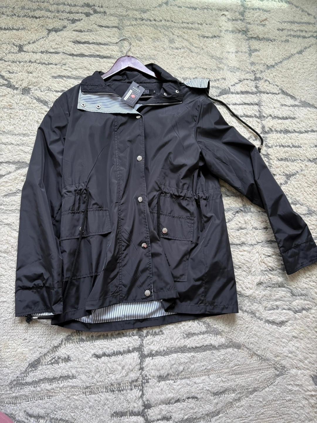 Black jacket with hood. A jacket with pockets. Waterproof. Lined with a striped pattern. Made of a light material.