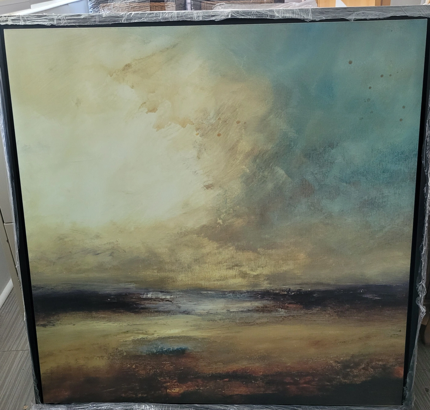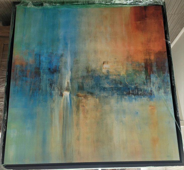 Beautiful canvas wall art. Features an abstract style. The painting is mounted in a black frame. This would be perfect for adding a touch of serenity to any space.