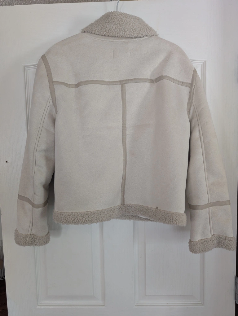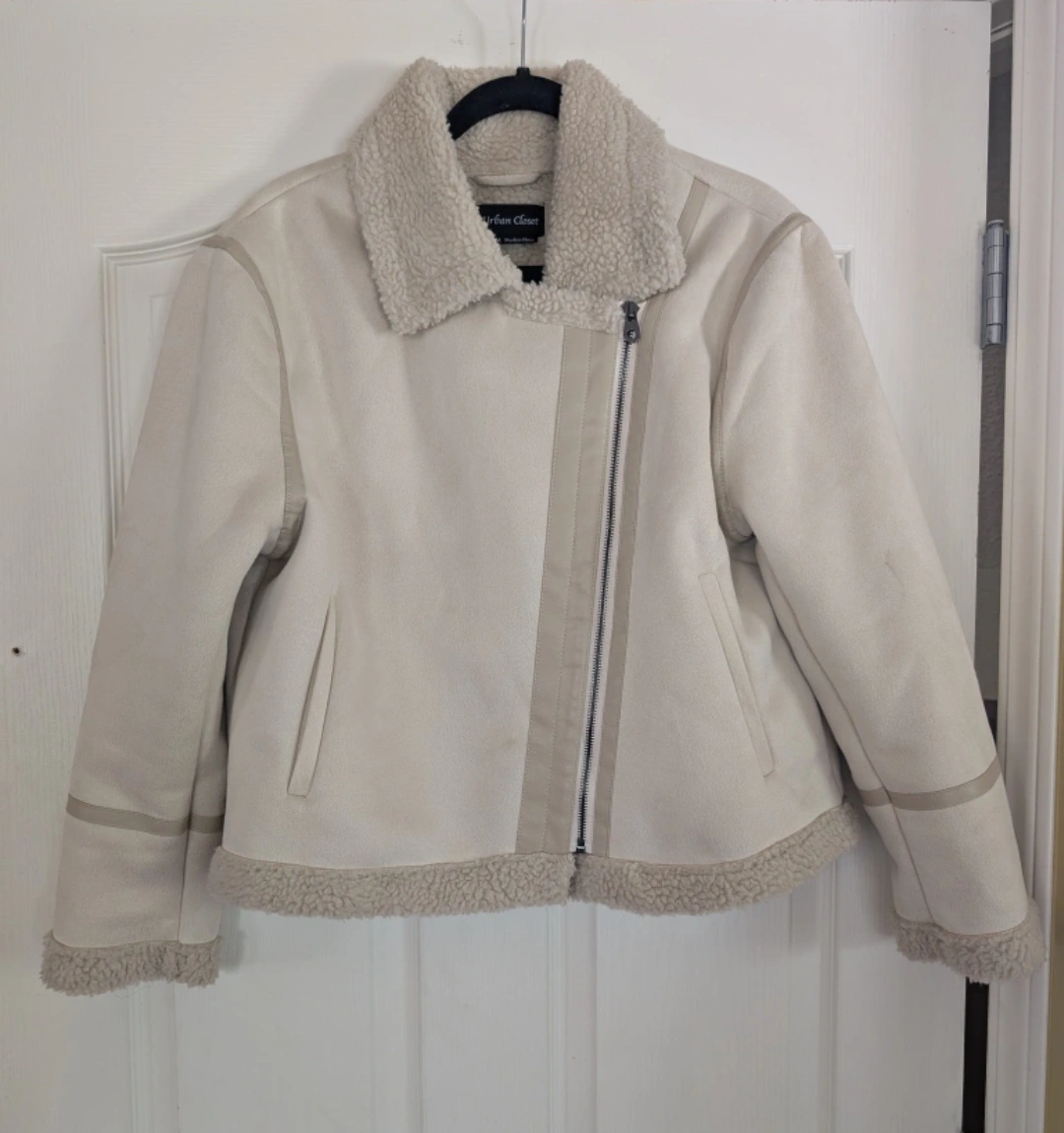 This cream-coloured jacket features a stylish design with a cozy, shearling-like interior and trim. It has an asymmetrical zipper. You will love wrapping yourself in this jacket on cool evenings.
