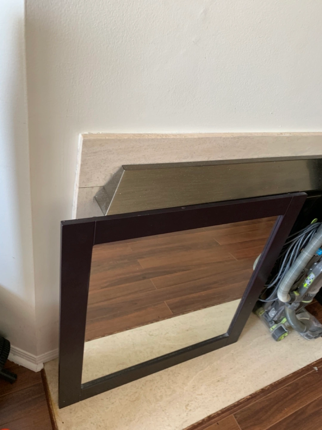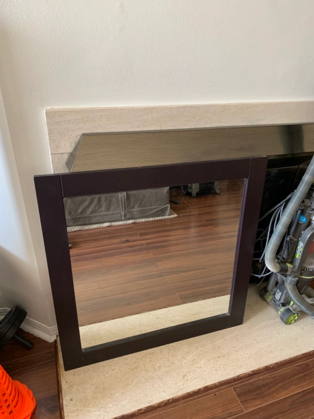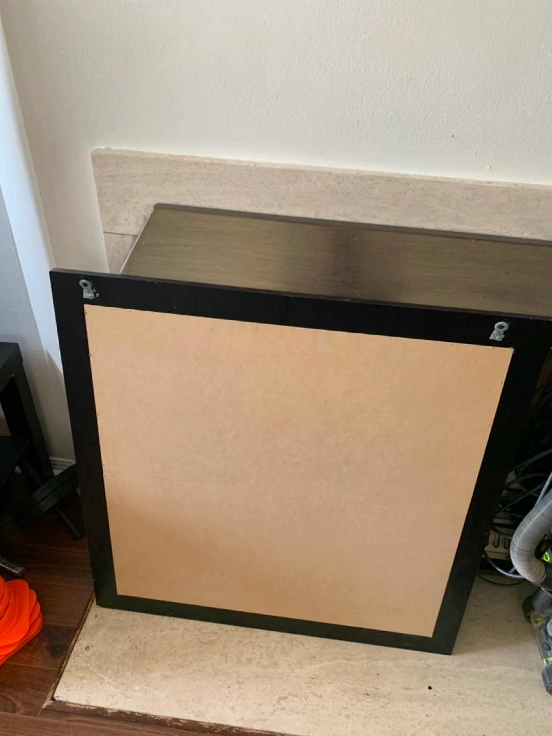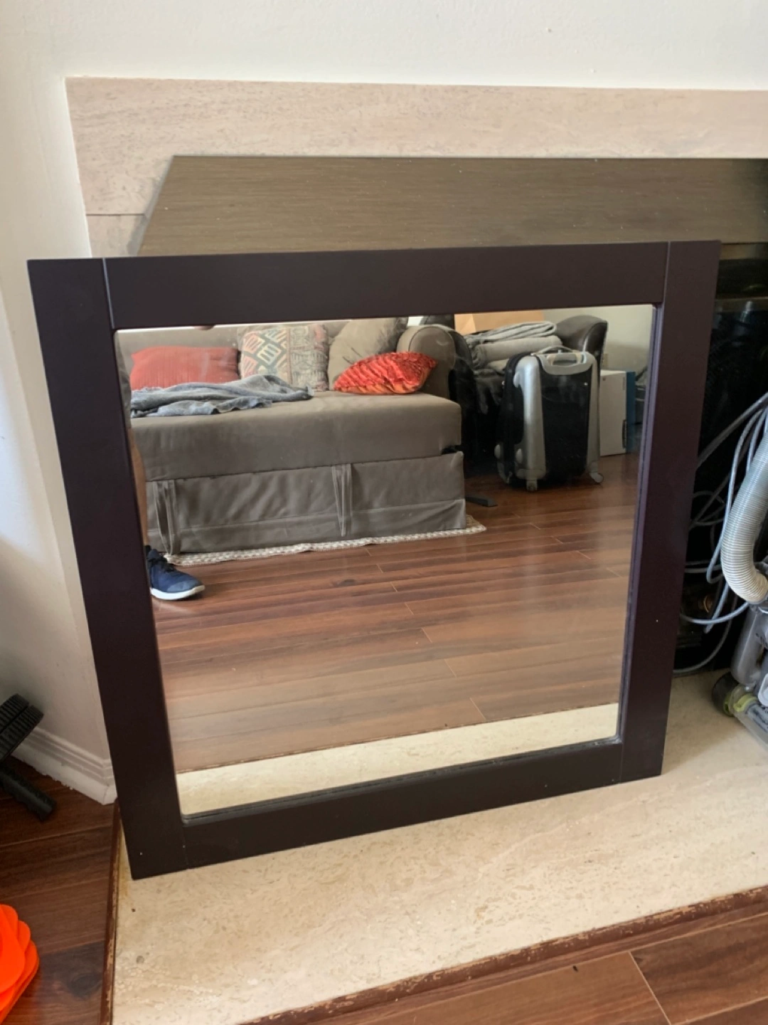 144A square mirror with a dark brown frame. The frame appears to be made of wood. There are hanging hooks at the back. This mirror would look lovely in a minimalist home.