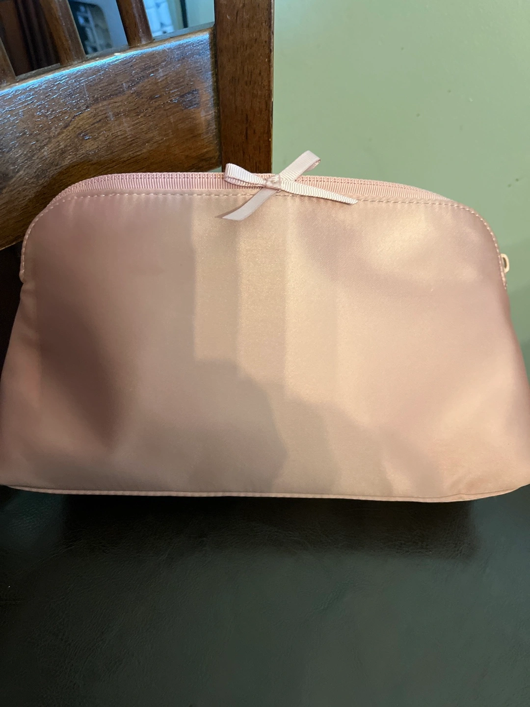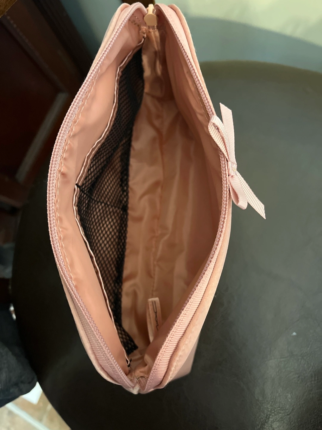 565A pink makeup bag. Features a bow on the top. Has a zippered closure. Inside is a black mesh pocket. A great place to store your cosmetics.