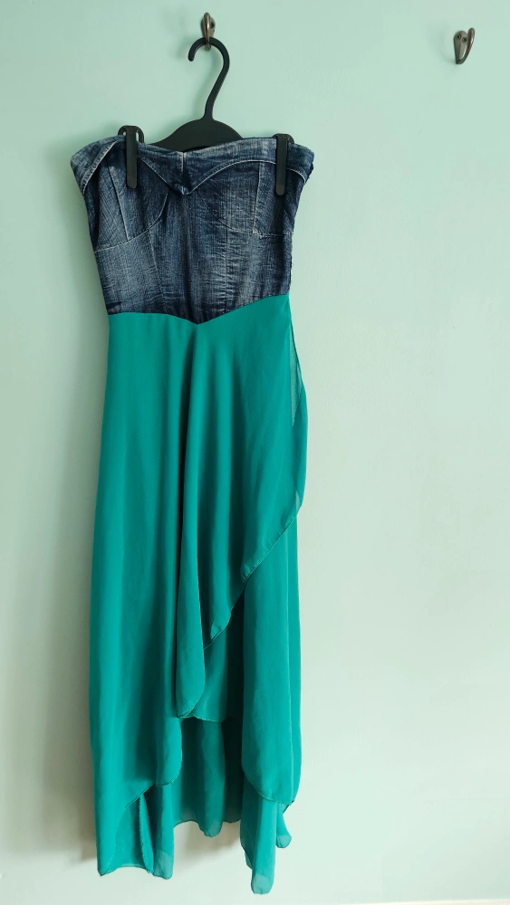 A gorgeous strapless dress. Features a denim bodice and a teal skirt. A perfect piece for a summer outing. Last pic of threading coming out, otherwise almost excellent condition.