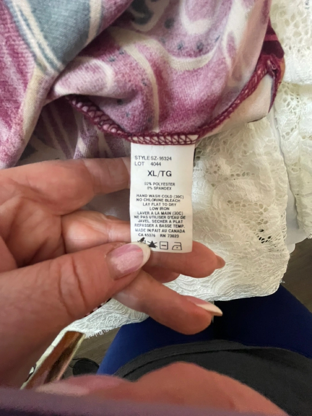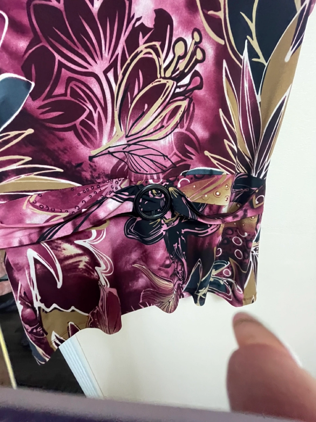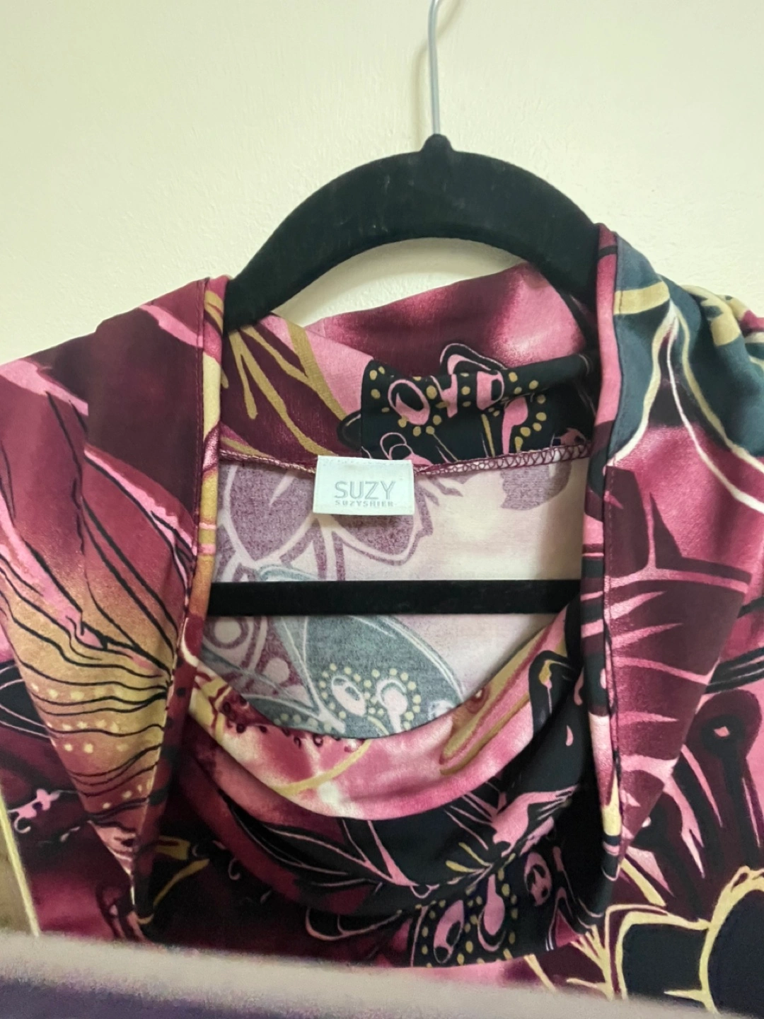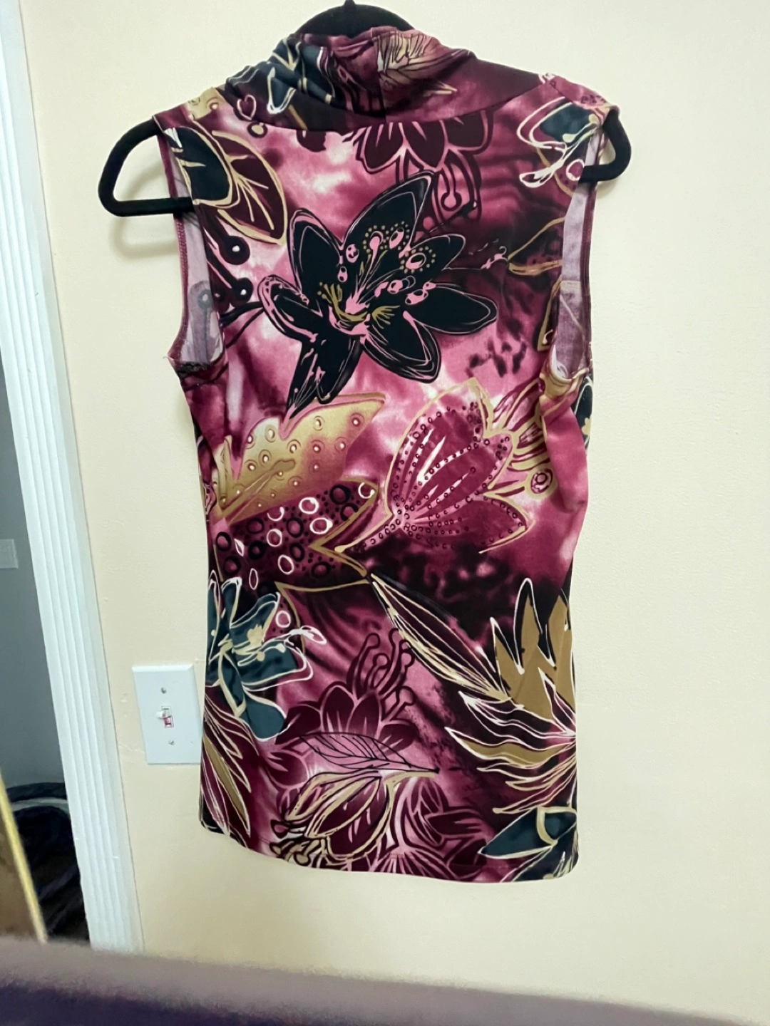 A gorgeous sleeveless top. Featuring a stunning floral pattern, a cowl neck, and a decorative buckle. The top is made in Canada. This would be perfect for a relaxing evening out or as office attire.