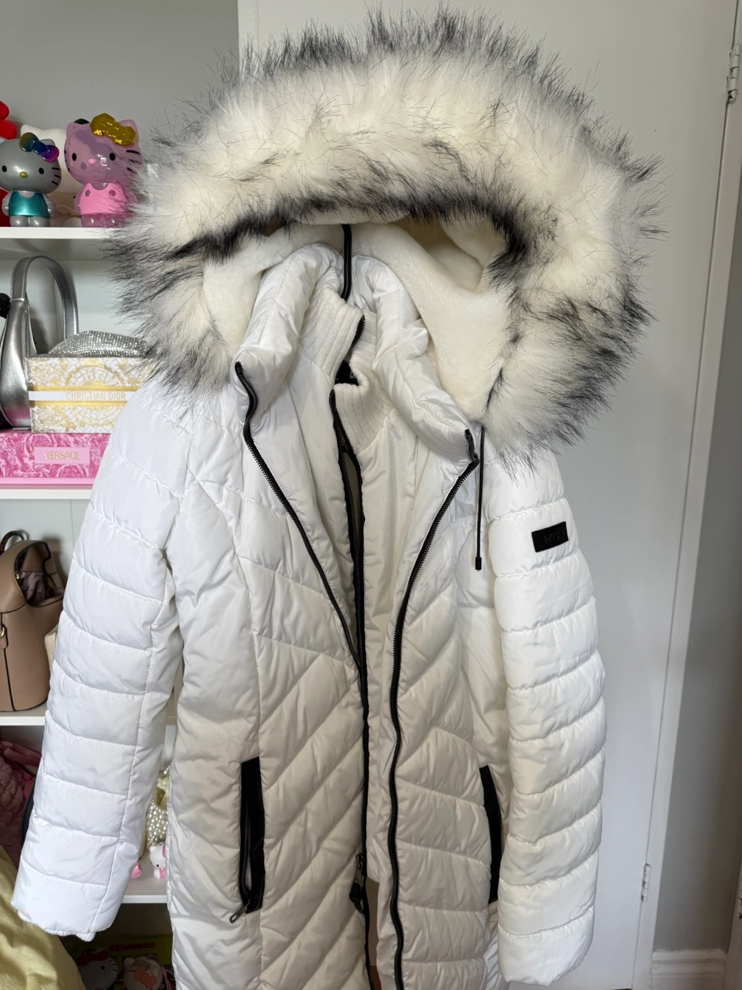White winter coat with black zipper details. Features a fur-lined hood. Provides warmth and comfort for those cold winter walks.