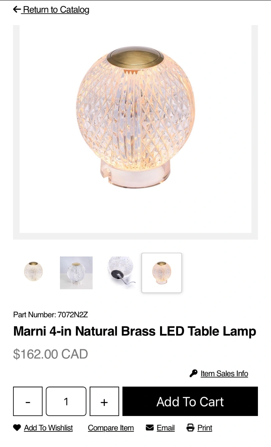 A crystal ball-shaped lamp with a brass-toned top. Comes with a clear circular base and a white USB charging cable. This is a great lamp to use beside a bed for a calming atmosphere.