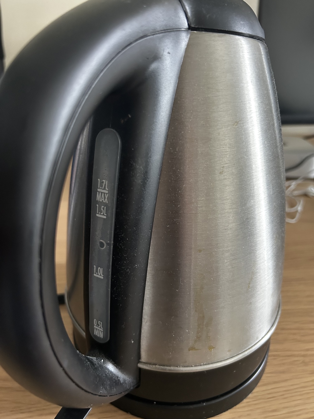 Shiny electric kettle with a black base and handle. Features a 1.7L capacity. Perfect for brewing your favourite warm beverage. Only getting rid of it because I got one of those fancy ones that lets you pick the temperature
