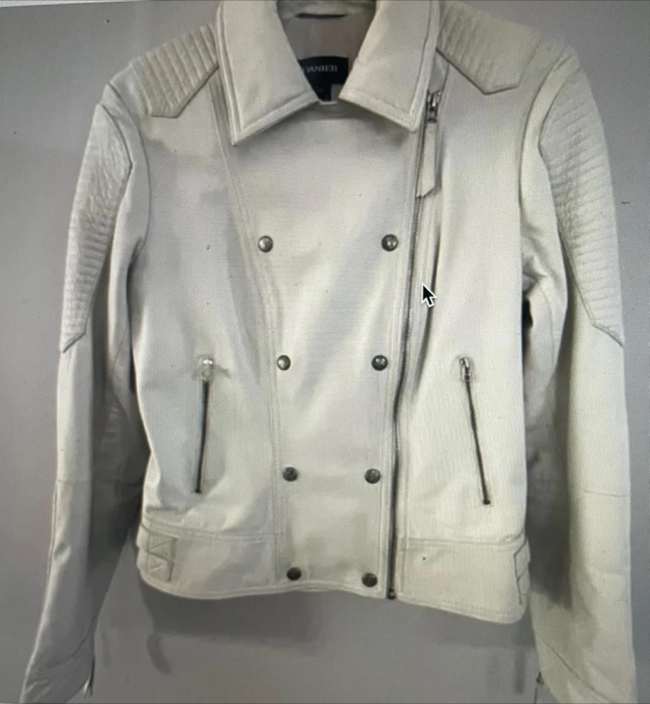 White coloured Bomber leather jacket. Features a zipper closure and pockets. Designed with silver hardware and buckle details. Imagine all the places you could go in this jacket, feeling stylish and confident.