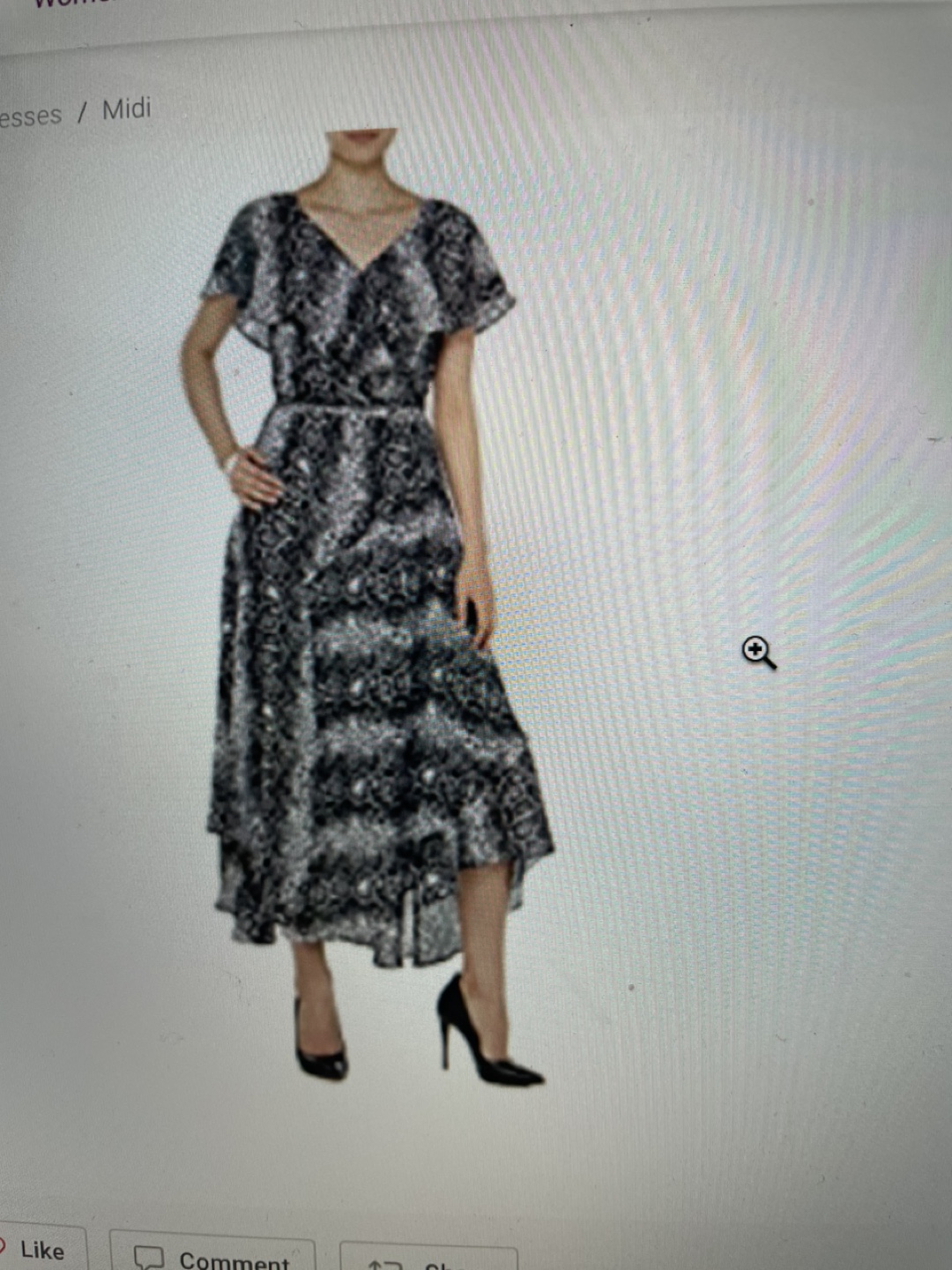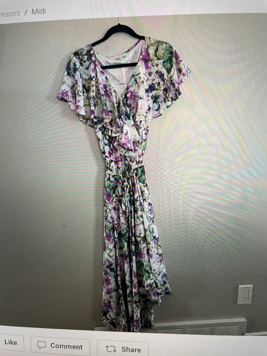 Never worn- A stunning floral midi dress. Features a wrap style with a tie at the waist. The dress has ruffle sleeves and an asymmetrical hem. A perfect choice for a relaxing summer stroll. First pic is a stock picture and is posted to show what the dress looks like on. The rest of the photos are the true colours of the dress.