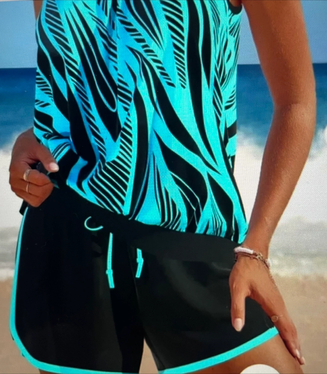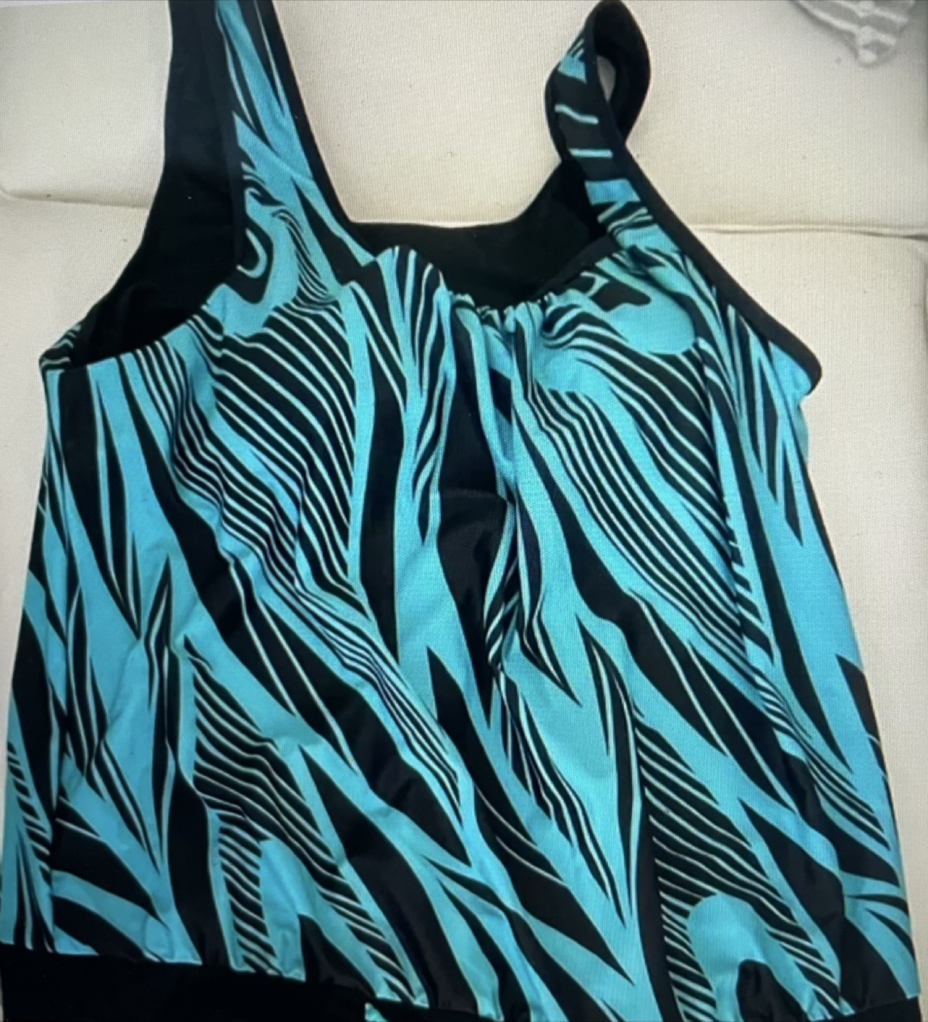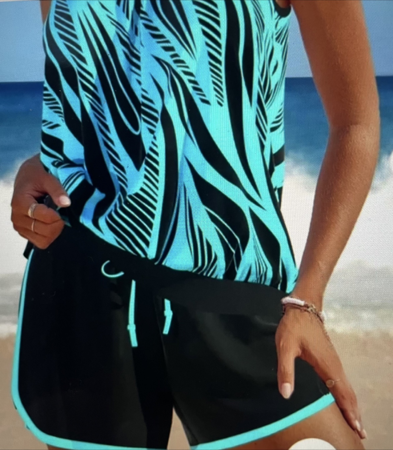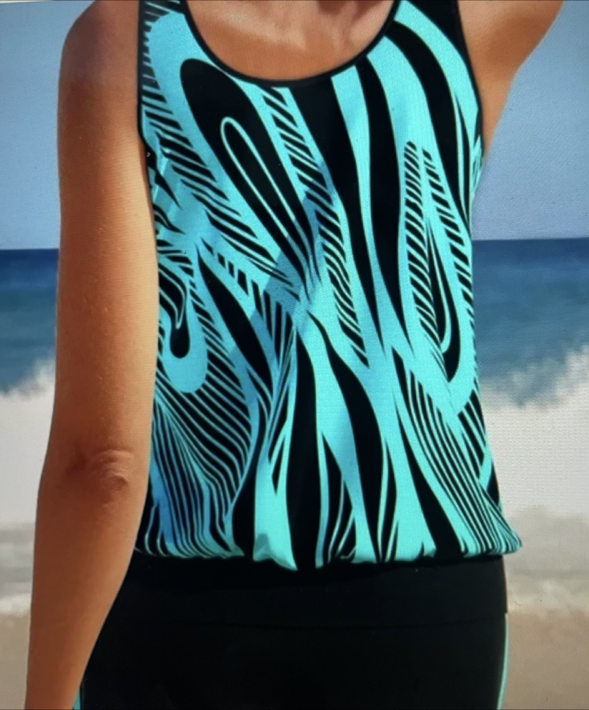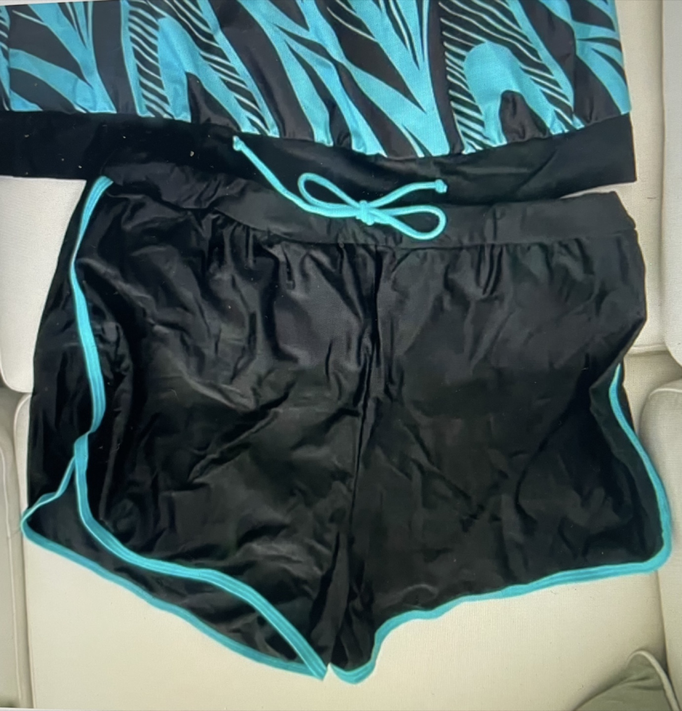 Brand New never worn- ordered wrong size. Tankini- Tank top with a fun teal and black pattern. Shorts are black with a teal trim. You might find this outfit perfect to wear on a sunny day.