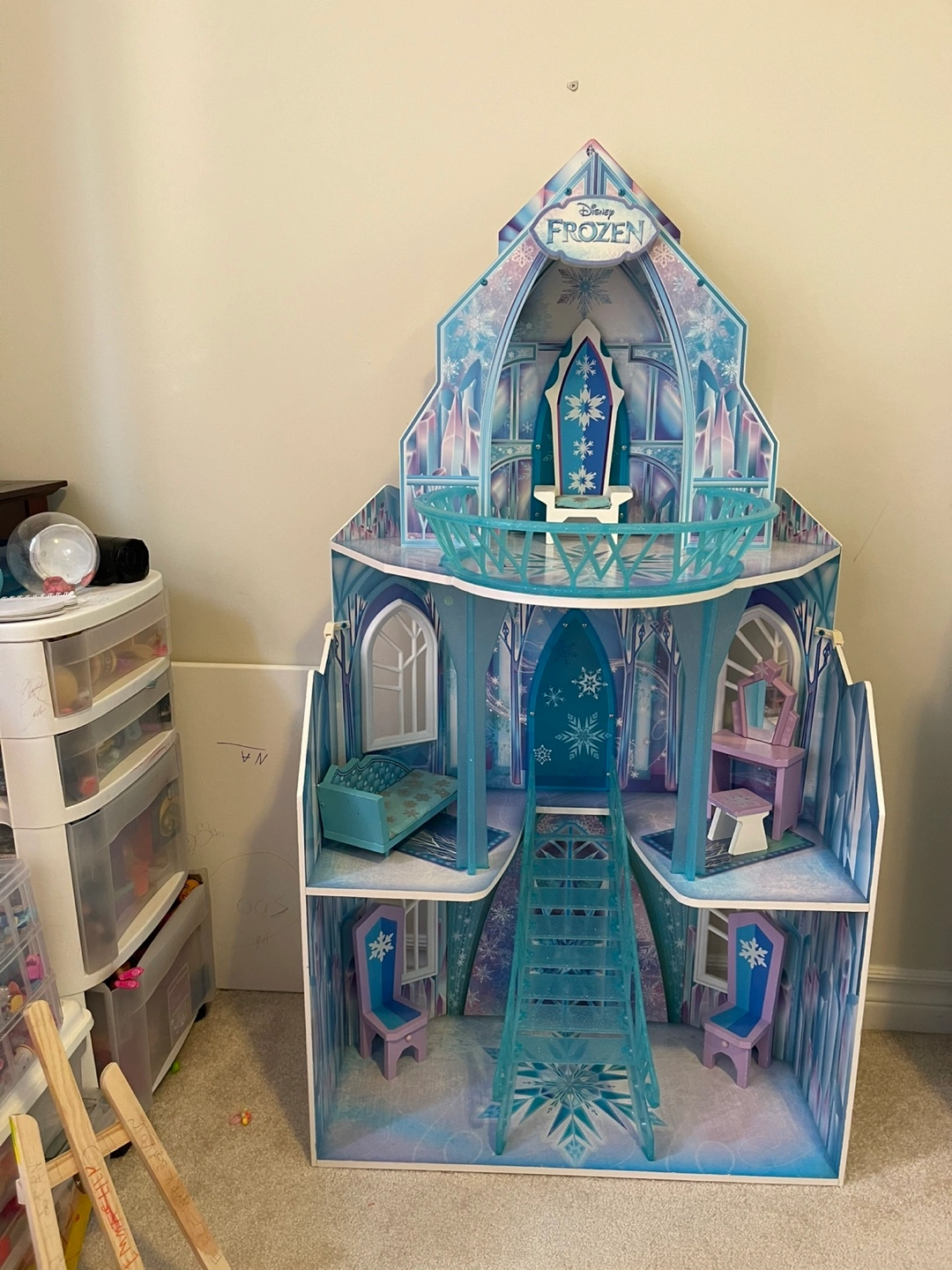 Large dollhouse styled as a castle. Features many rooms, furniture, and a large staircase. The design has a blue and purple colour scheme with ice-inspired details. This toy can be a great addition for a child's imaginative playtime.