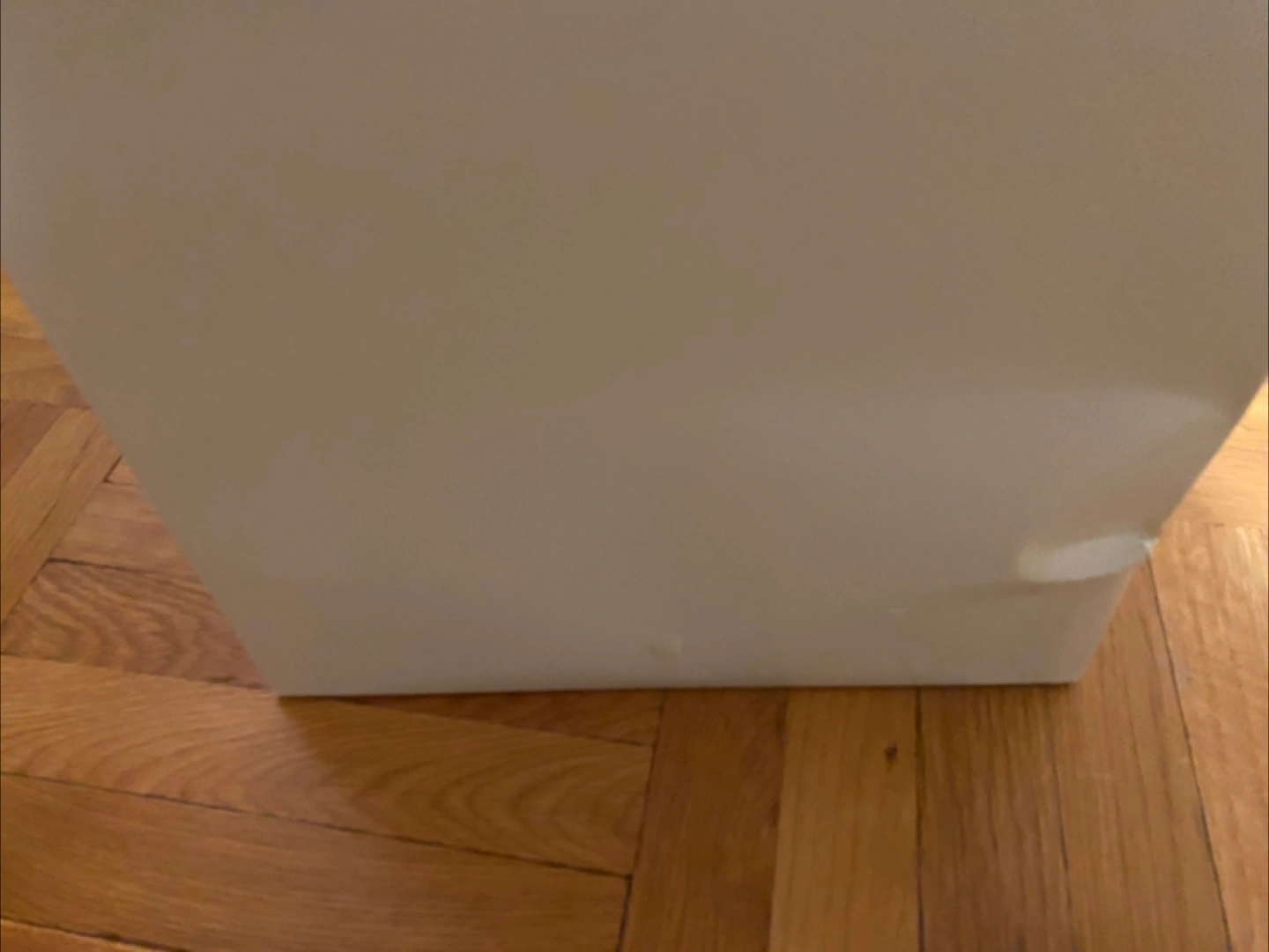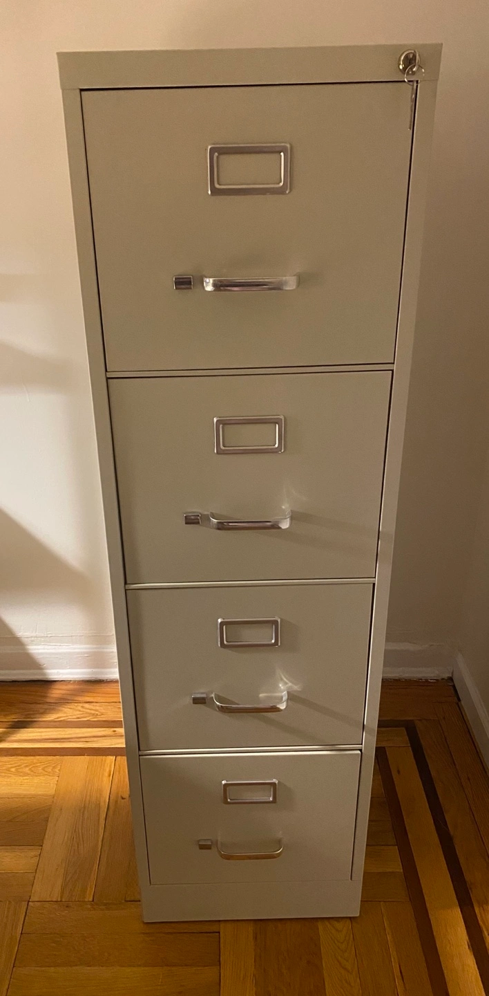 File cabinet with multiple drawers and silver handles. A great way to organize your home or office space. It’s new but has a dent at the bottom. It doesn’t affect the drawer opening and closing just aesthetics