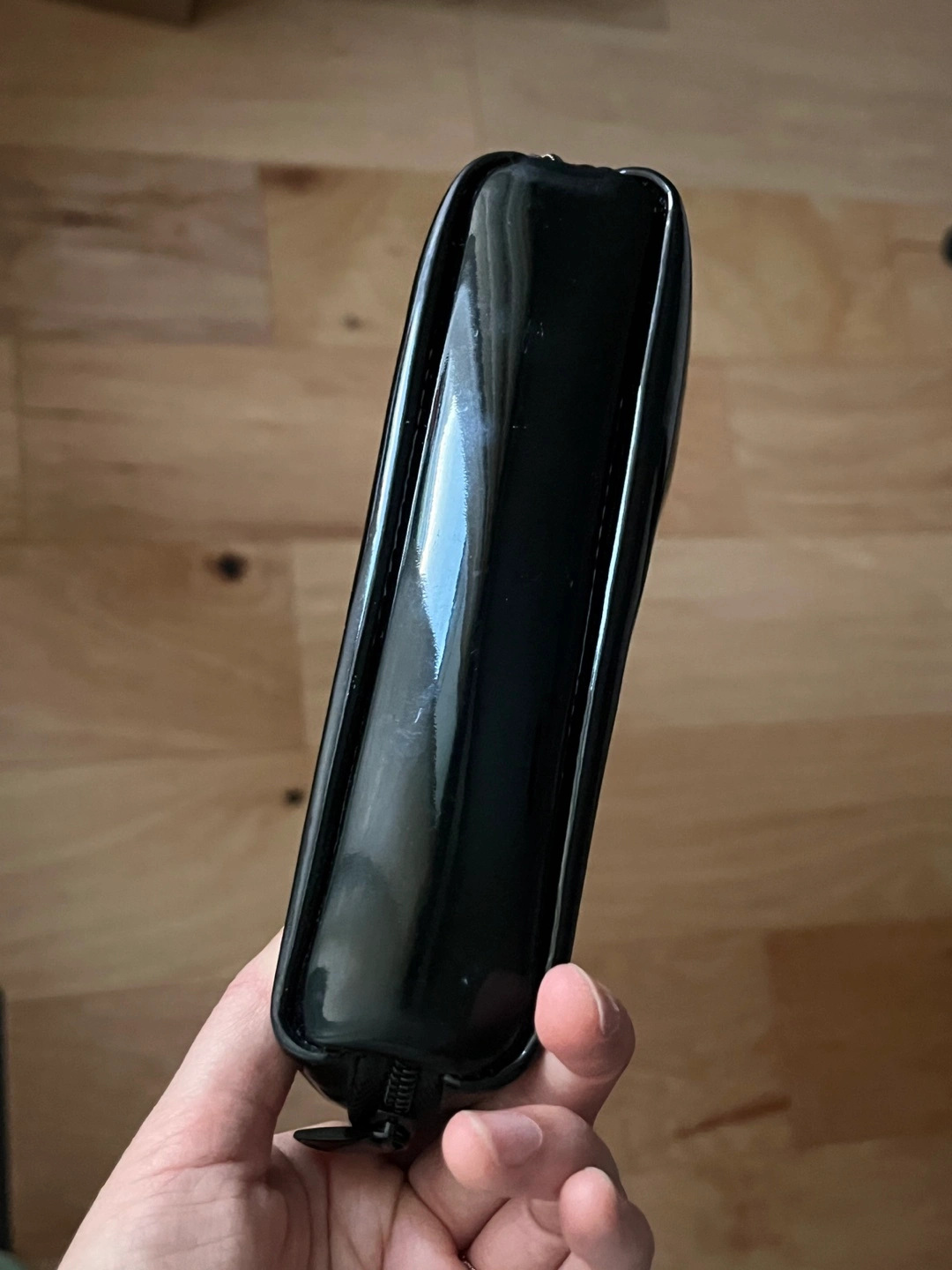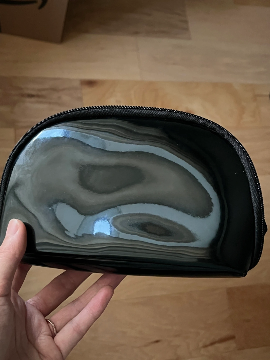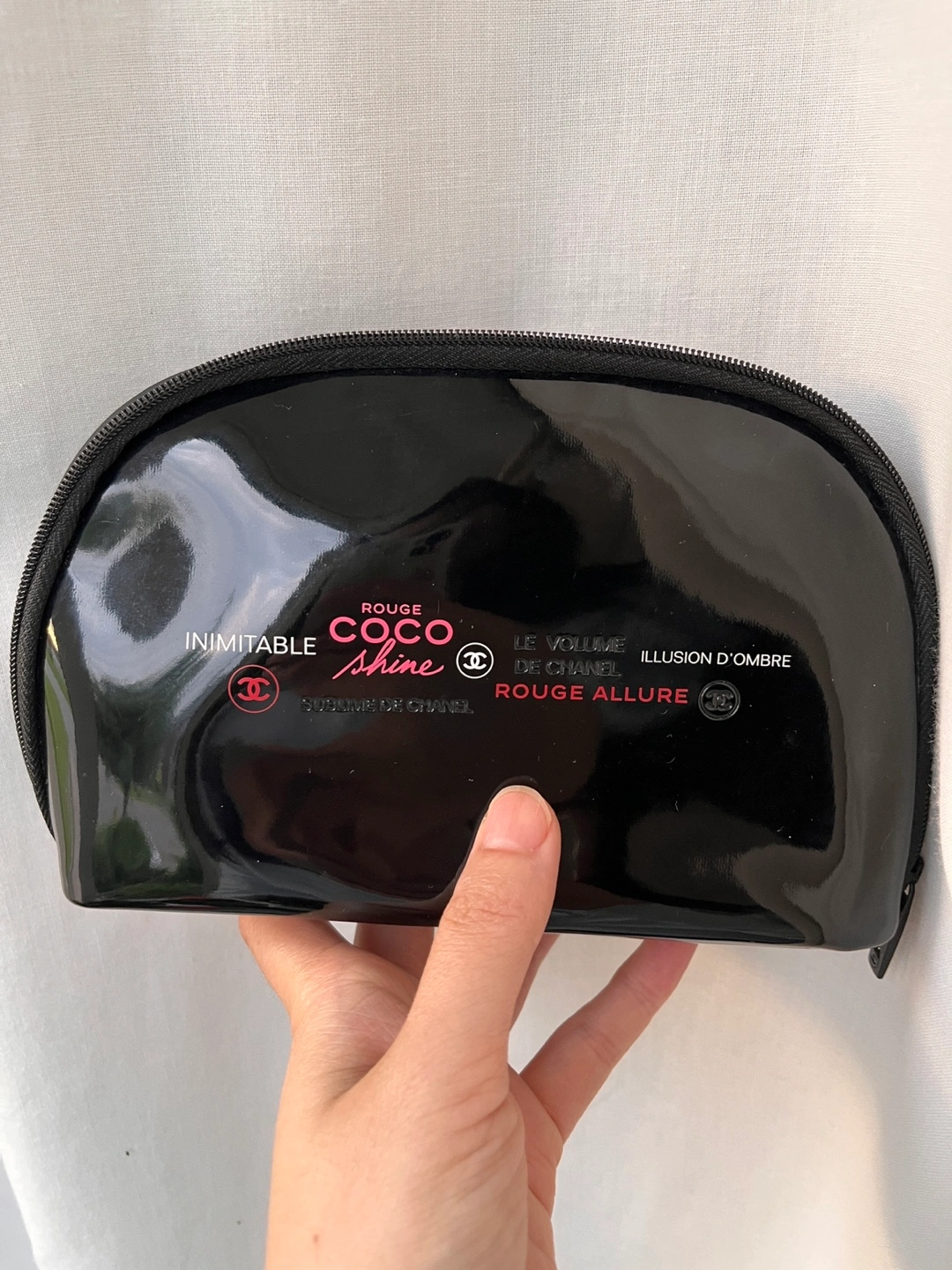 A black cosmetic pouch. Made of patent material. Features a zipper closure. The interior is lined. Perfect for storing all your beauty essentials and keeping them organized. Pick up Victoria park and O’Connor.