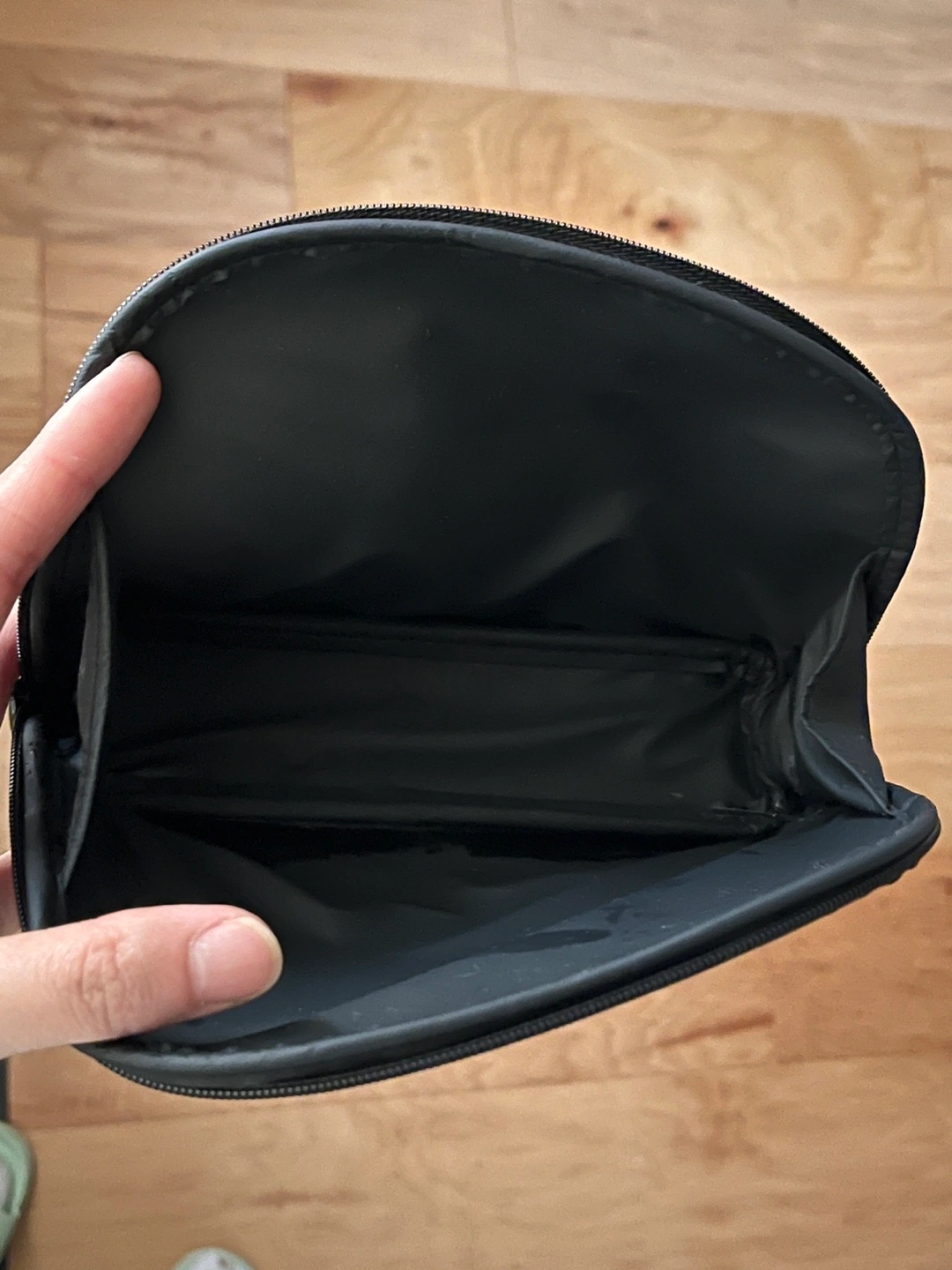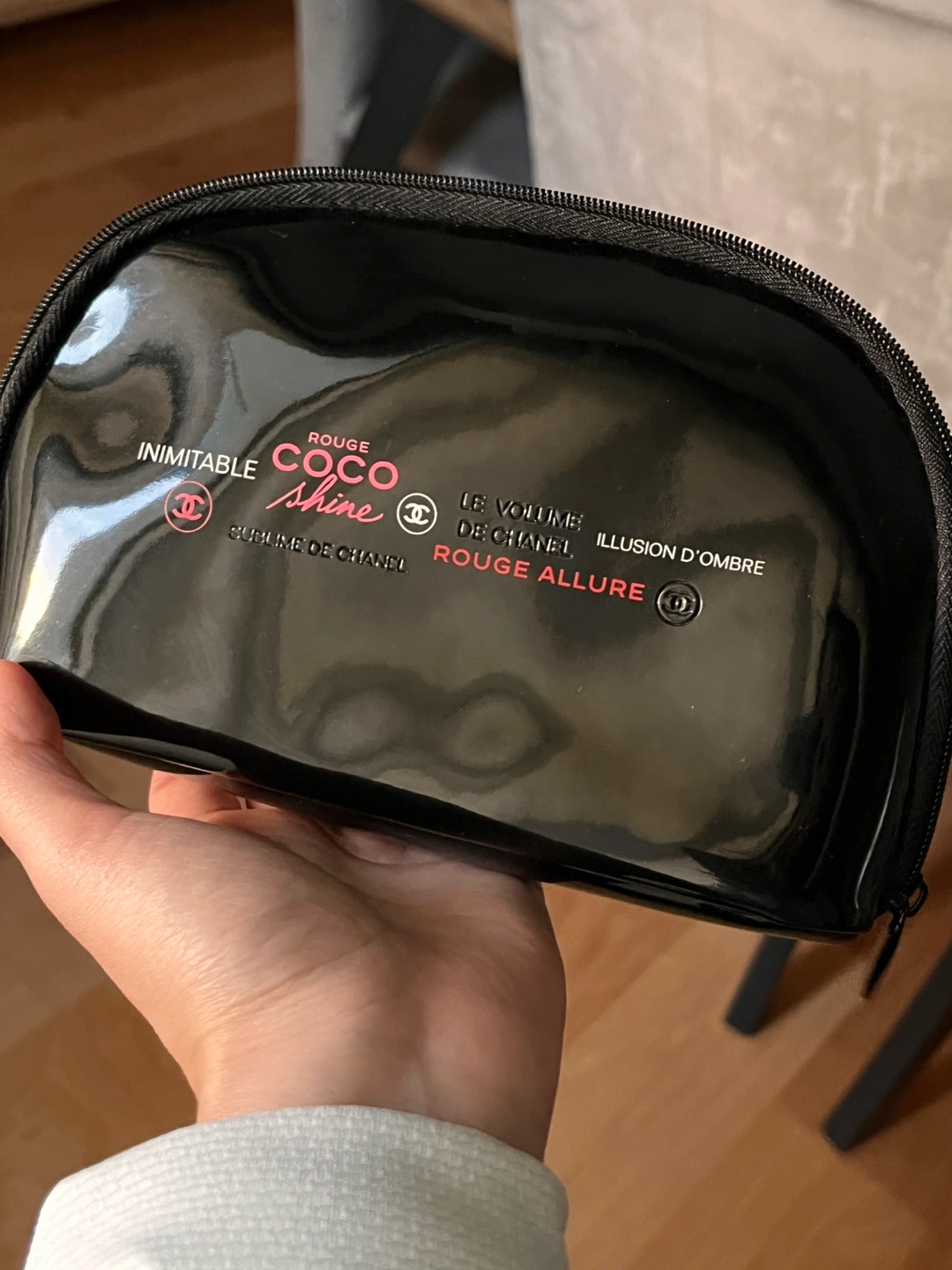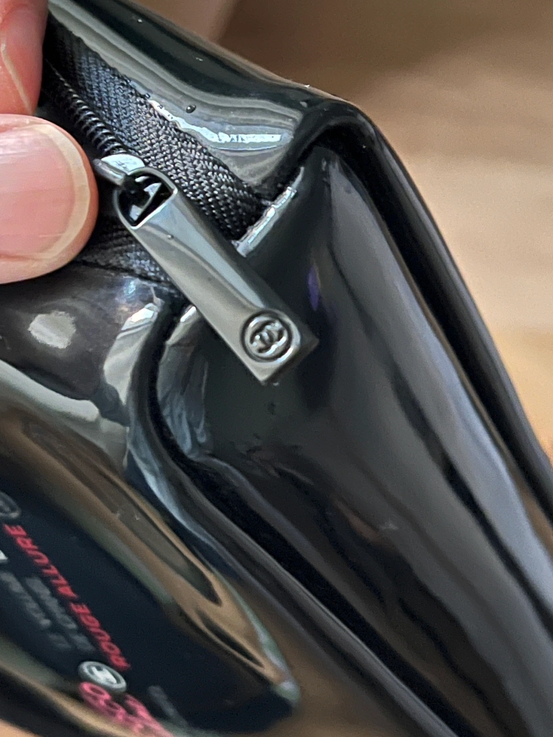 A black cosmetic pouch. Made of patent material. Features a zipper closure. The interior is lined. Perfect for storing all your beauty essentials and keeping them organized. Pick up Victoria park and O’Connor.