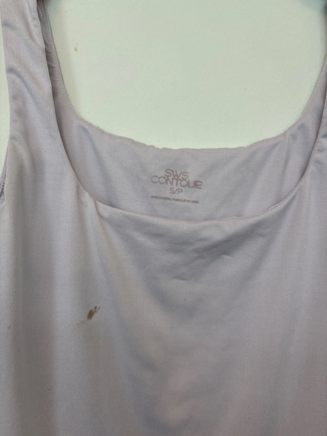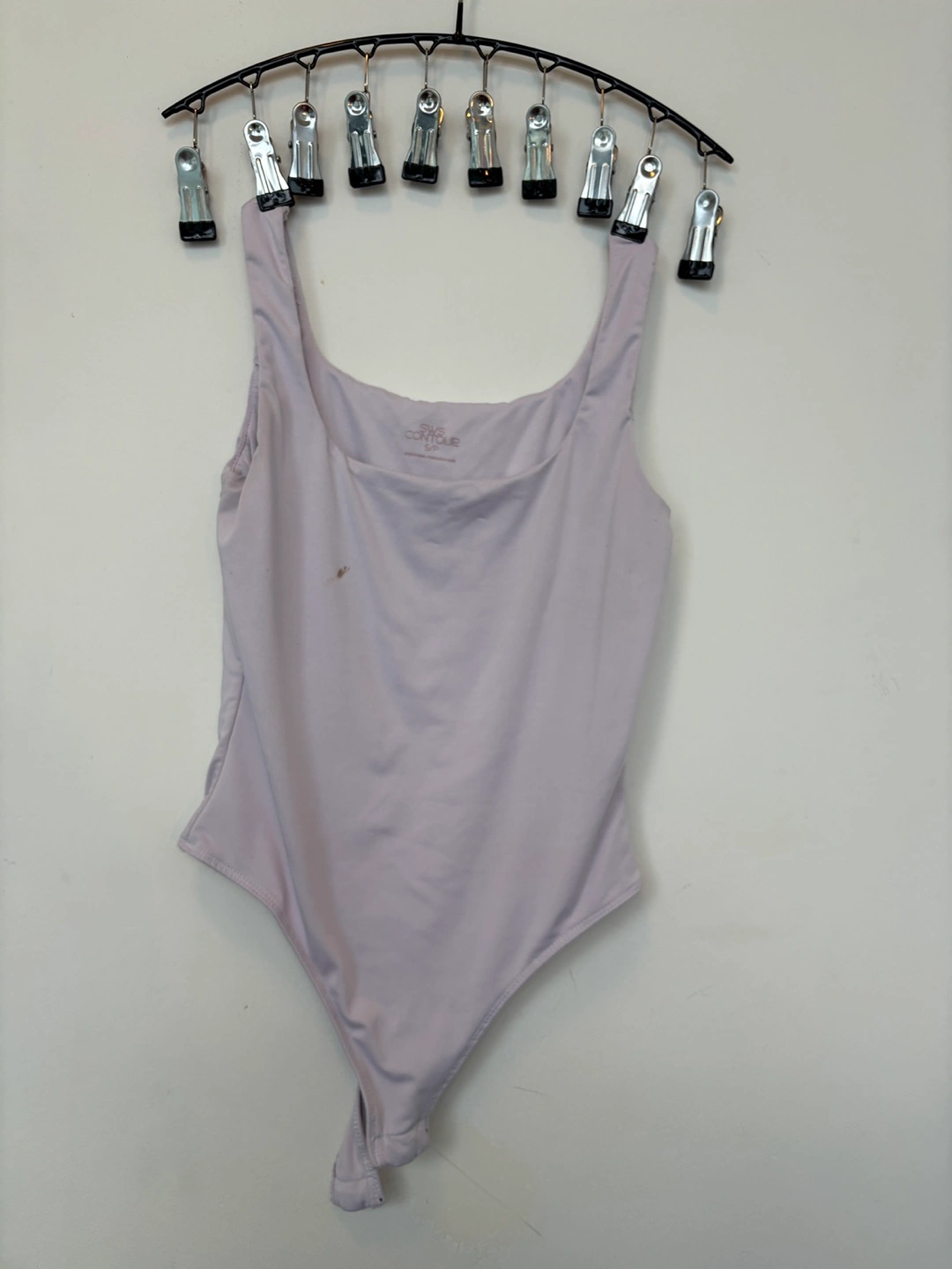 A light lavender bodysuit. Features a square neckline and tank straps. There is a small spot on the front. This piece can be a great addition to your wardrobe when you are looking for comfort. If you can clean it- take it. I bought a replacement and I do not want to throw it.