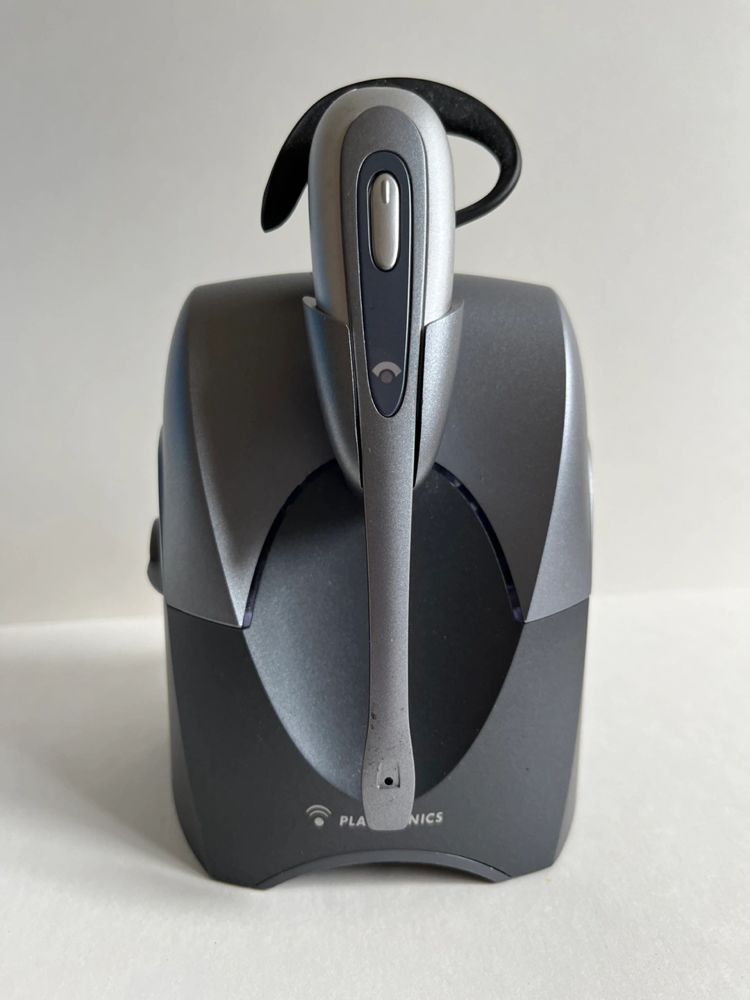 Plantronics CS55 wireless headset system for corded phone, using the phone’s handset port to provide signal for the headset.