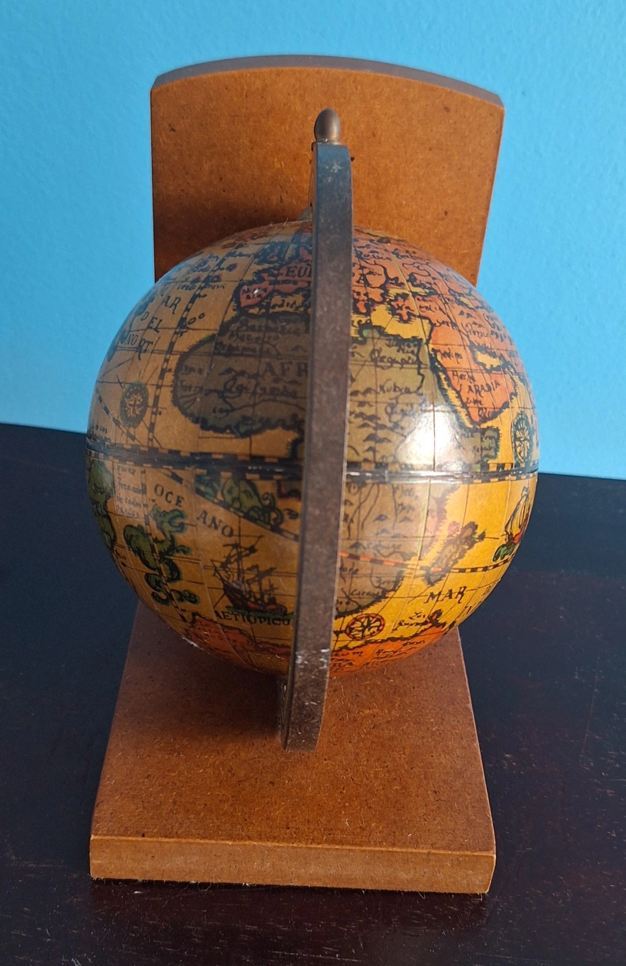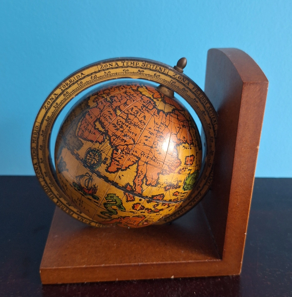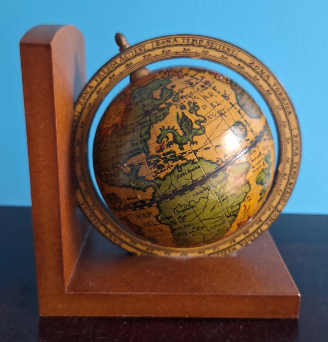 Vintage old map globe bookend. Globe surrounded by a ring, spining around, attached to a wooden base. Looks great on any bookshelf. Made in Italy.