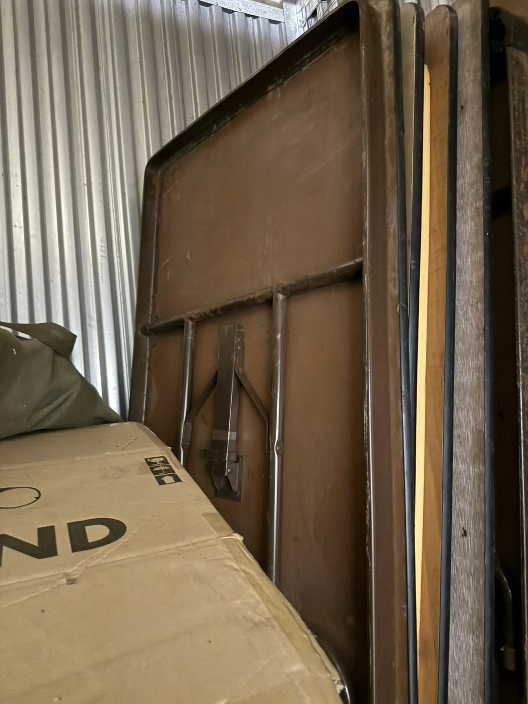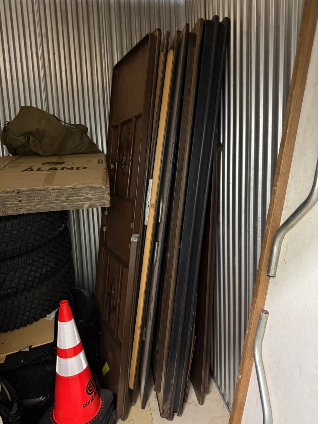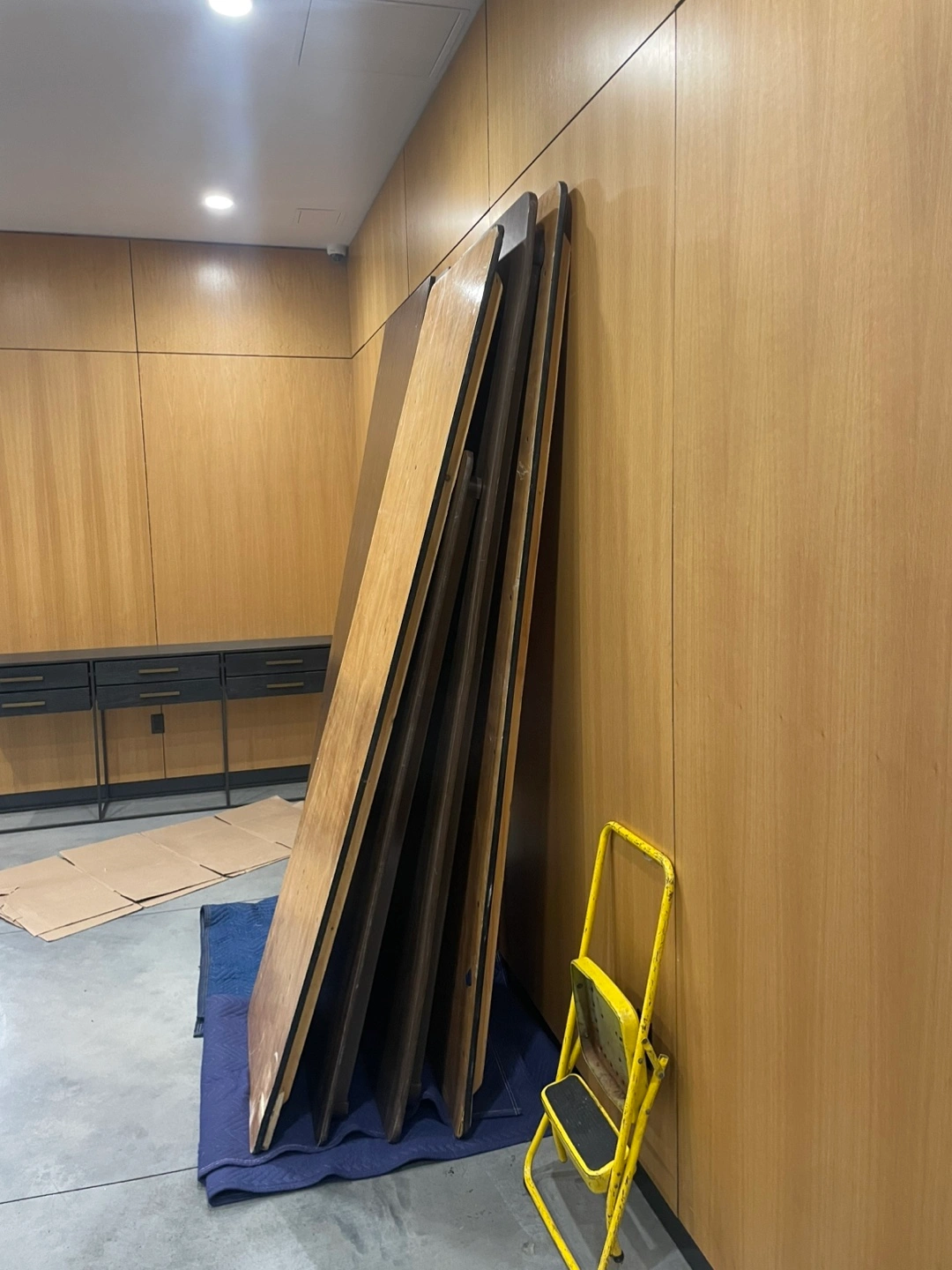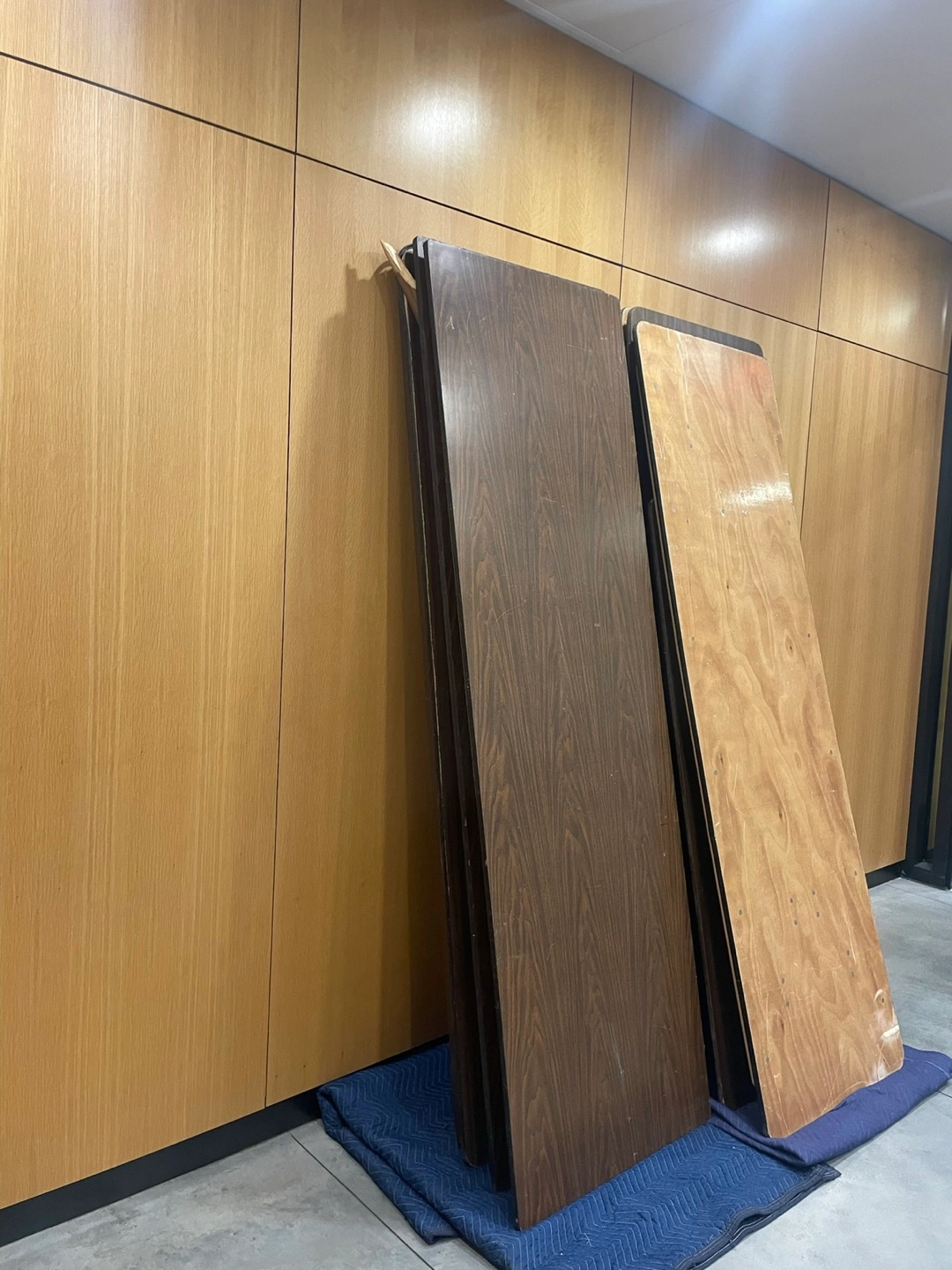 Long rectangular tables. Stacked against a wall. Folding type. Great conferences, parties, and office spaces.
