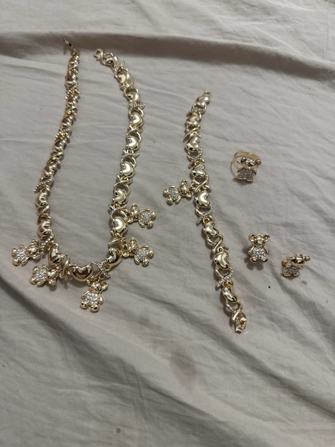A lovely set featuring a necklace, bracelet, ring, and earrings. Golden colour. Bear and heart shaped detailing, with small stones. Perfect for any occasion, it is a timeless treasure to add to your collection.