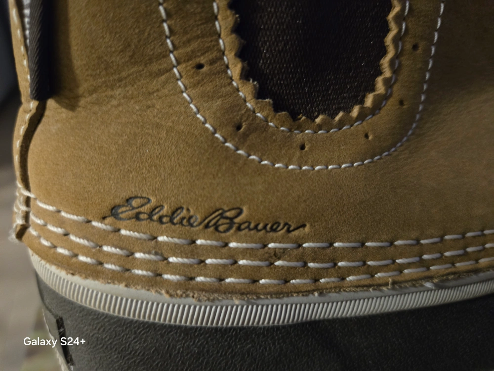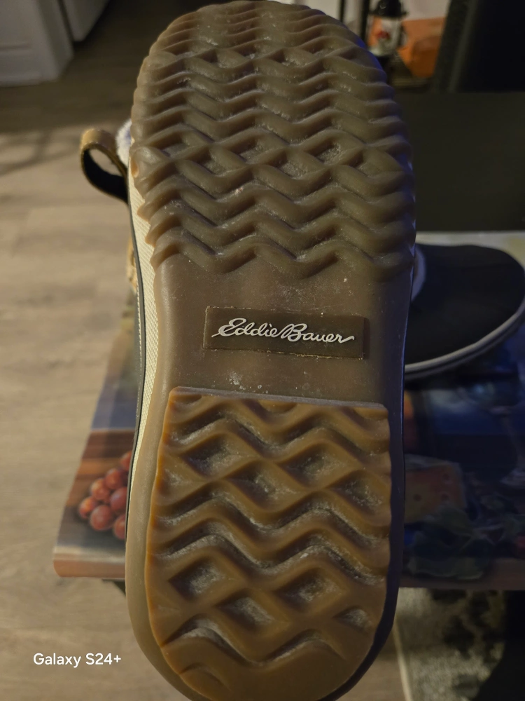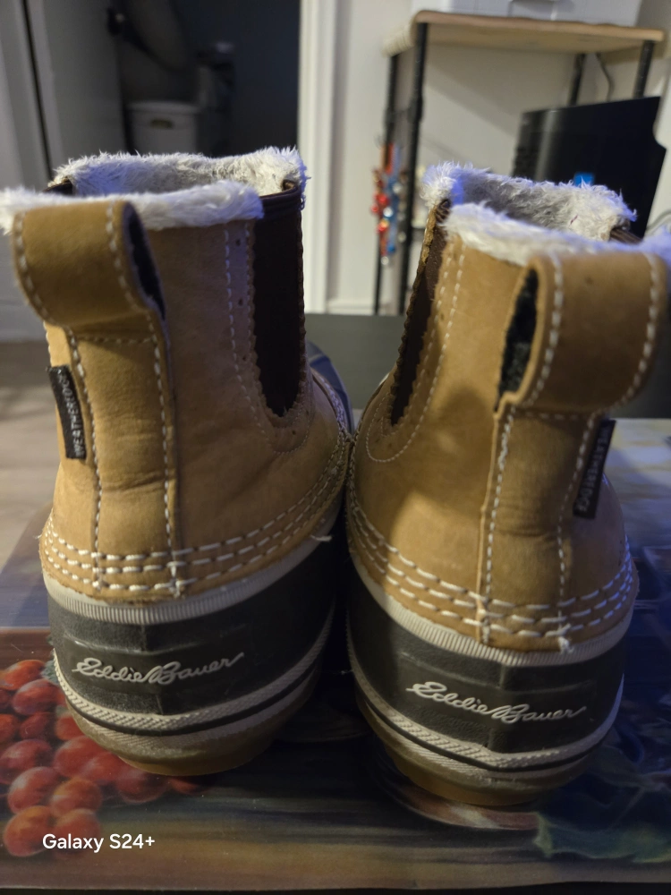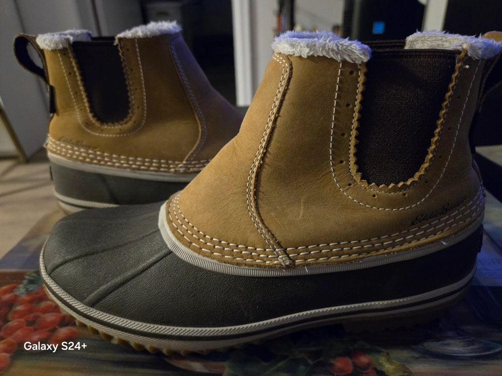 These ladies boots feature a two-tone colour scheme. The boots have a rubber foot and leather upper. The interior looks to be lined with faux fur, offering warmth for winter. They would be perfect for exploring the outdoors, or for a walk in the rain or snow. Was only wore twice.