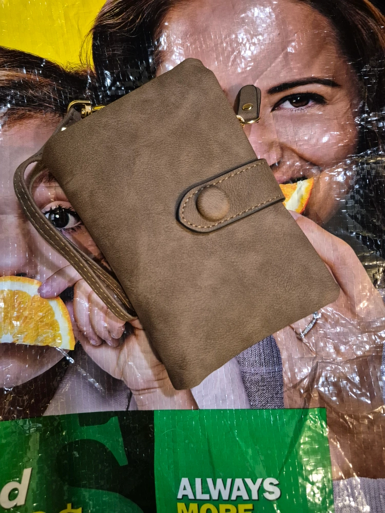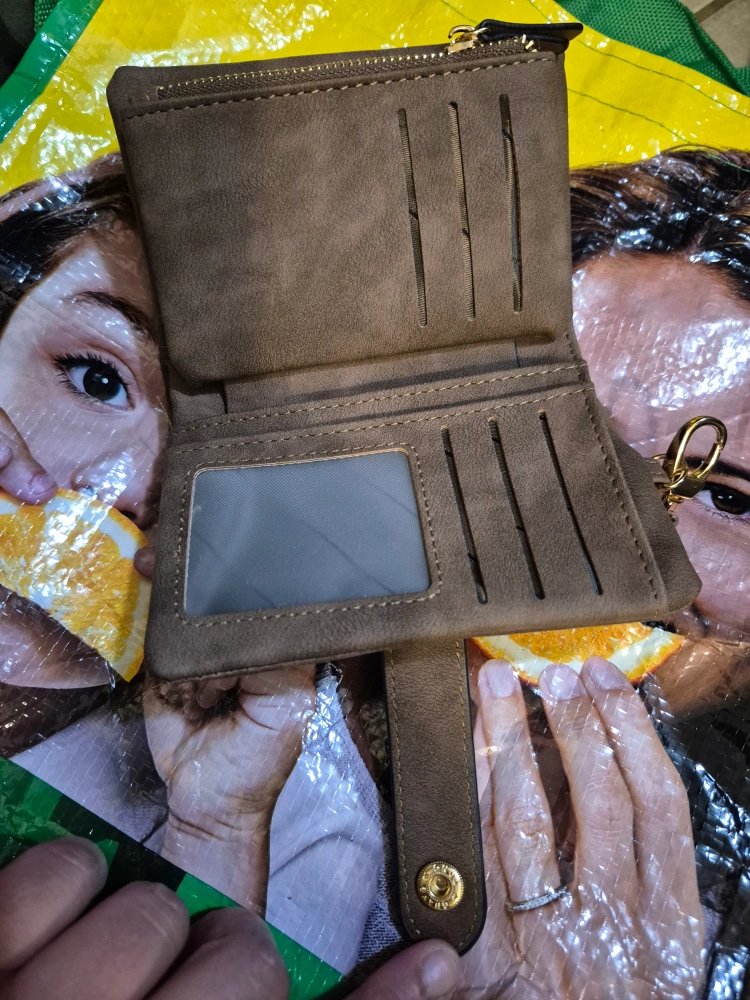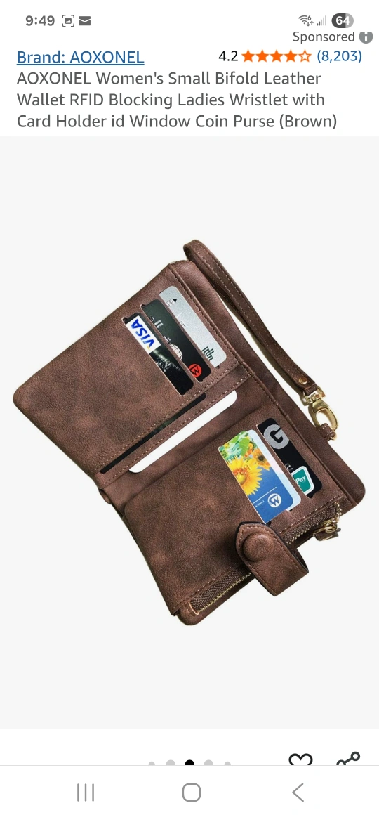 A brown RFID Blocking bifold wallet. Features multiple card slots, coin pocket, and zippered compartments. Attached is a wrist strap. This wallet could bring you ease while on the go.