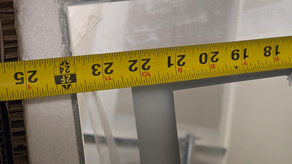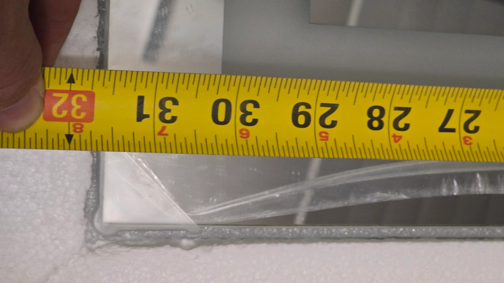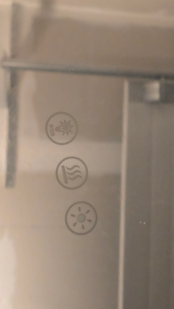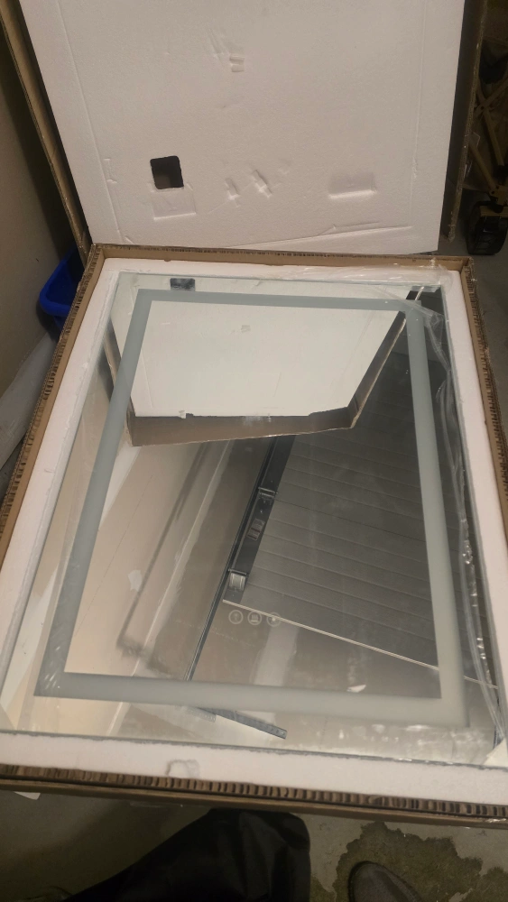 A framed mirror. It appears to have a light around the border, and it is rectangular. Could make a great addition to your bathroom to get ready for your day. There are some control symbols on the mirror’s surface as well.