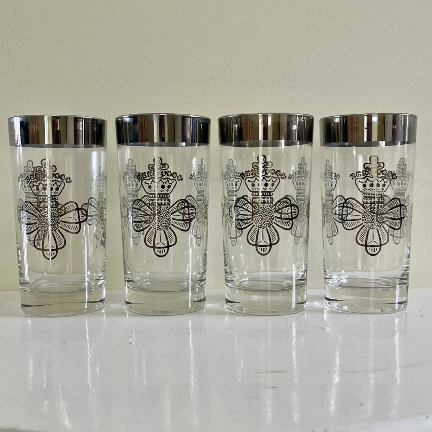 Set of four vintage Royal Queen Bee silver lusterware glasses from the 1960s, reminiscent of Dorothy Thorpe designs. These glasses feature a stunning silver overlay pattern, adding a touch of mid-century modern elegance to your table. Excellent vintage condition. 5.5” tall.