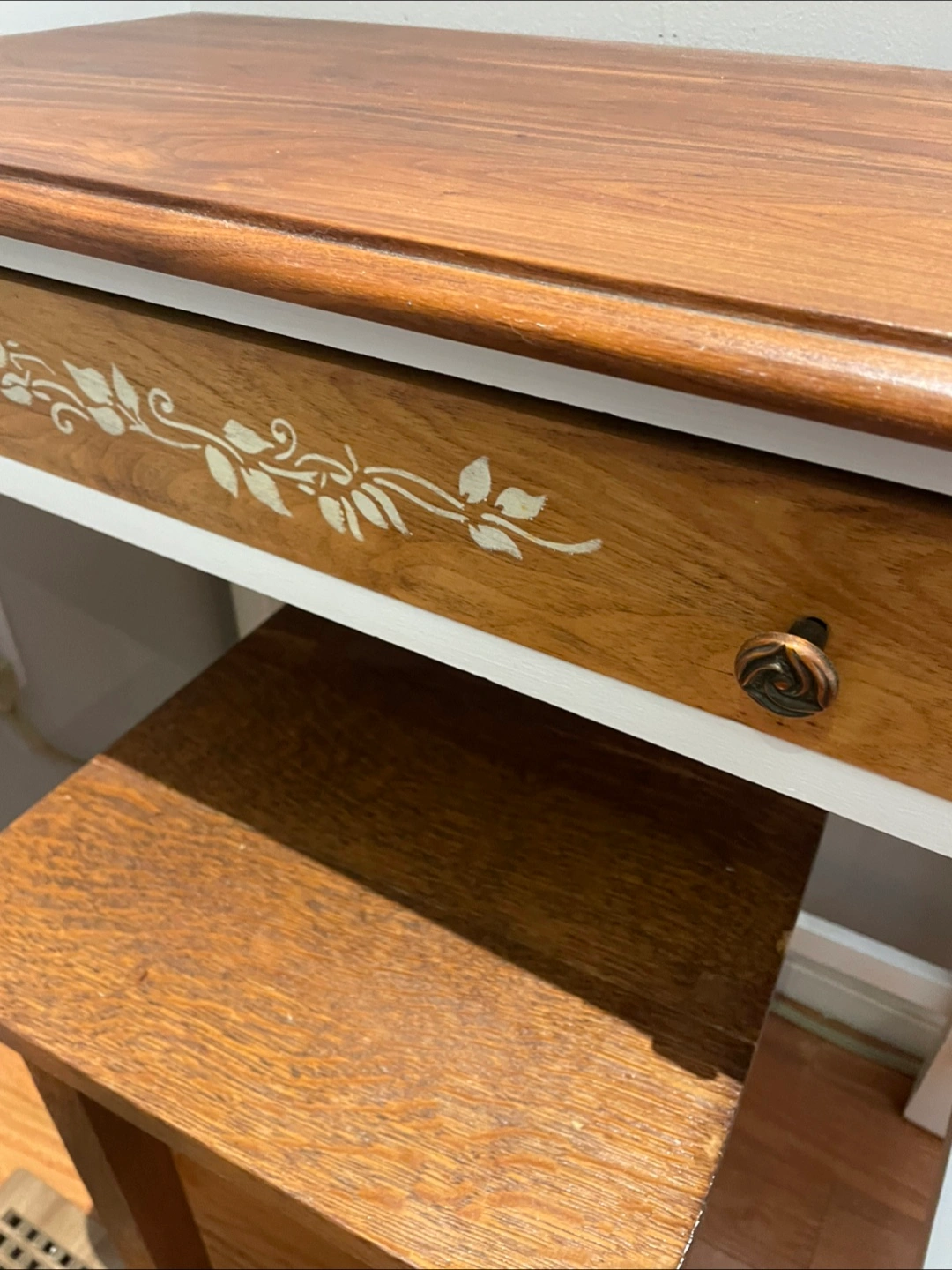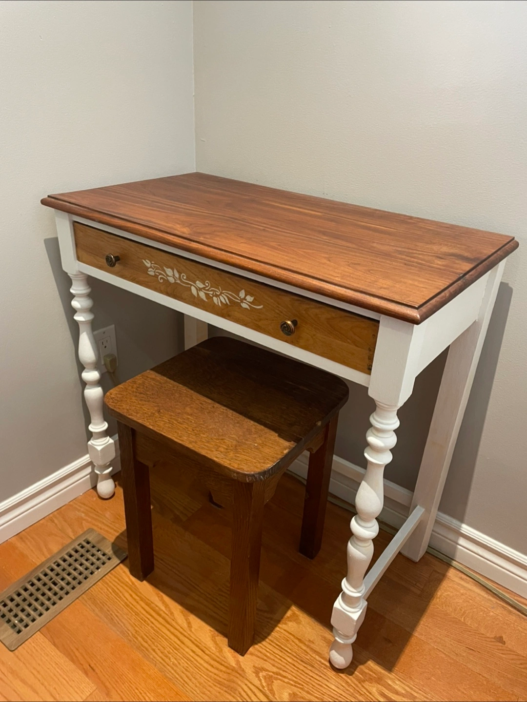 Nice small desk with drawer, the top of desk and the stool are walnut