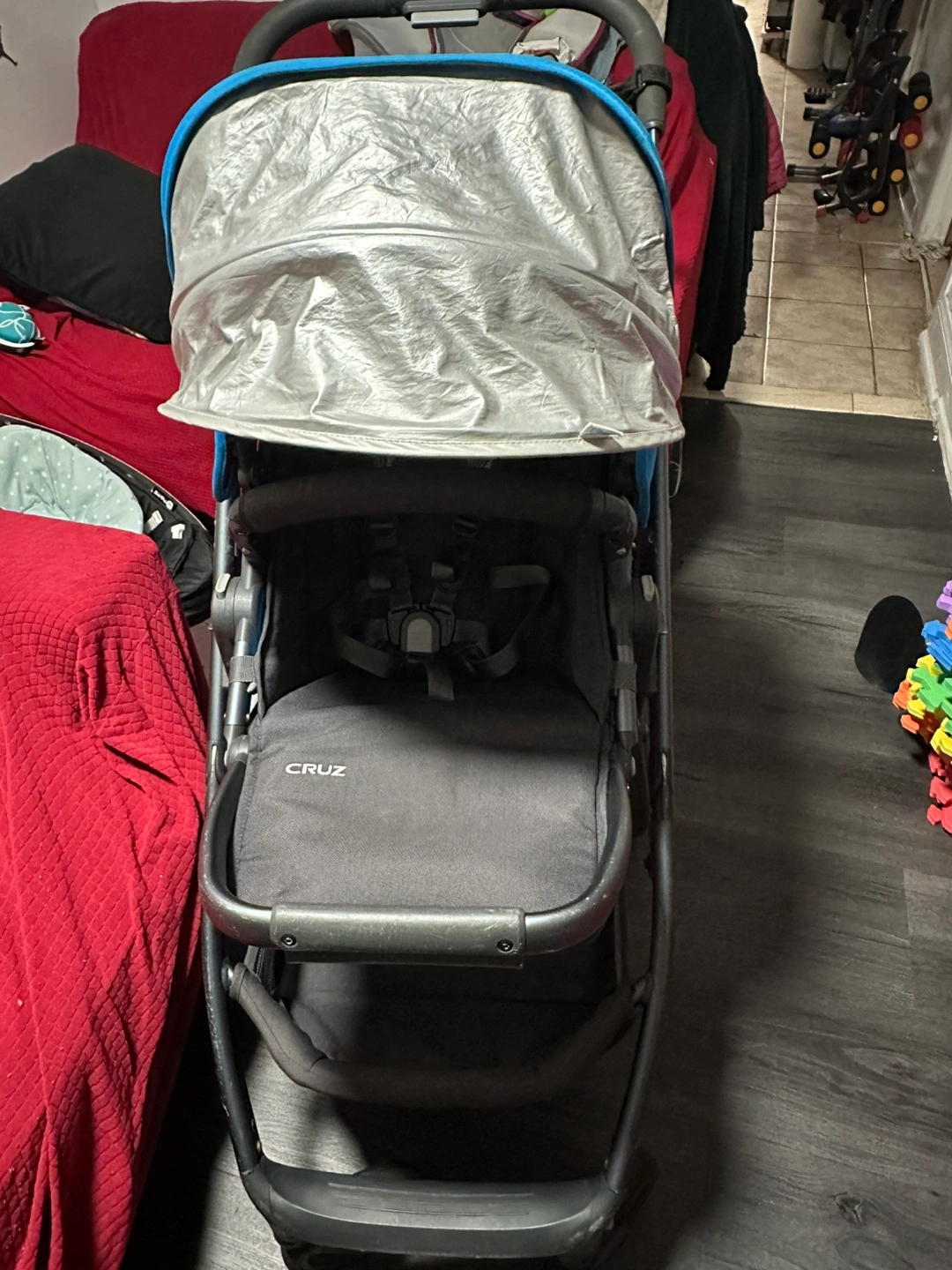 A lovely stroller and car seat set. Features a blue seat and a sun shade. The stroller has a comfortable handle and storage underneath, perfect for carrying all the essentials. Take a stroll with your little one in this amazing set for peace and relaxation.
