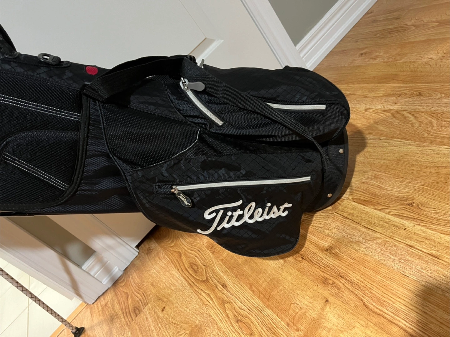 Titleist Golf bag in black. Multiple pockets, compartments, comes with rain hood attachment. White accents. Shoulder strap and a stand. Legs slides a bit depending on weight of clubs. In good condition. Wear and tear on legs.