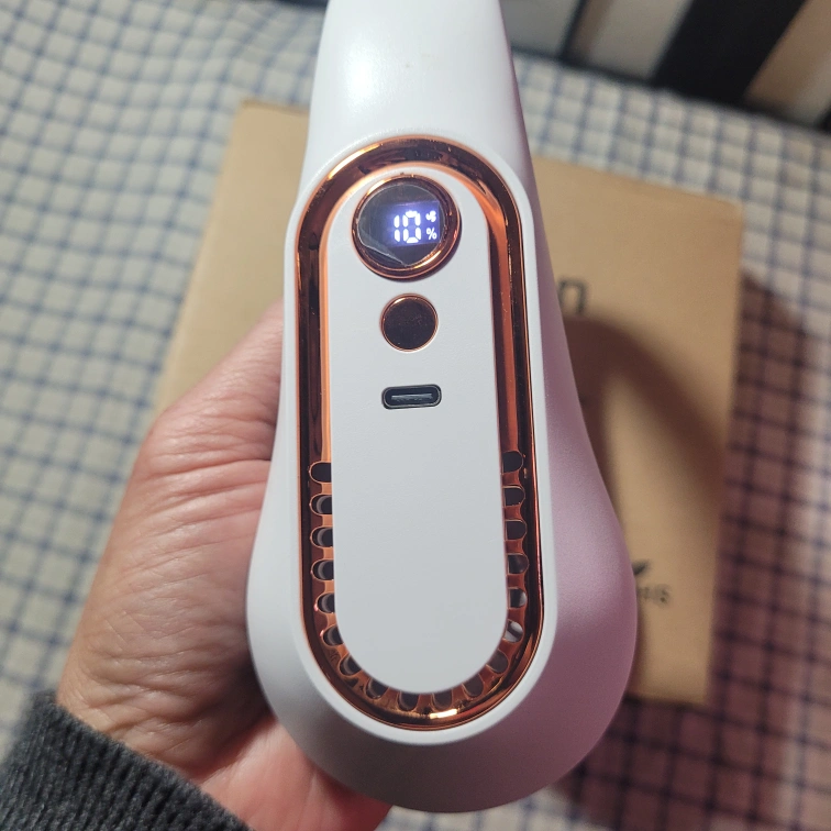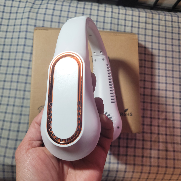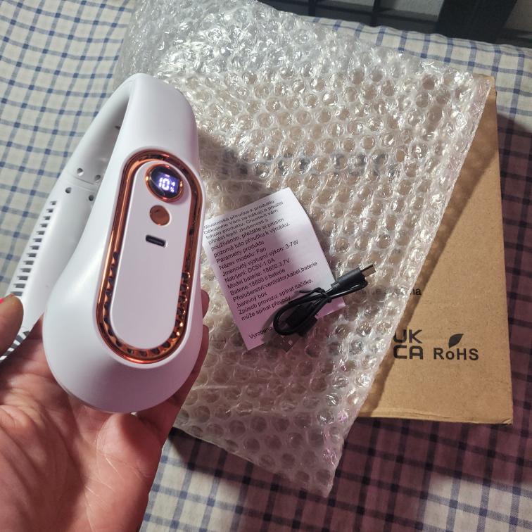 White and rose gold neck fan. In the box was never used. Perfect for staying cool on a hot day. USB charger and manual included.