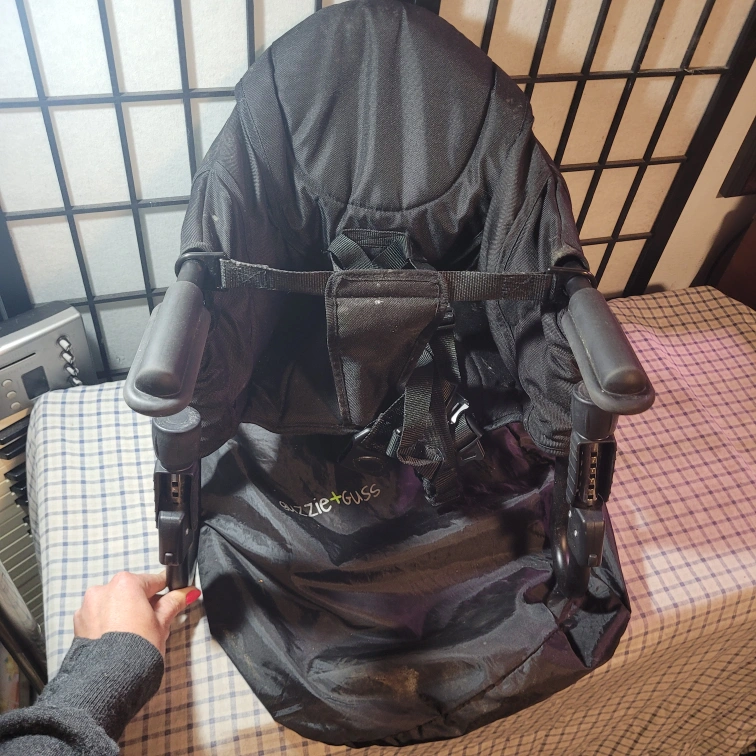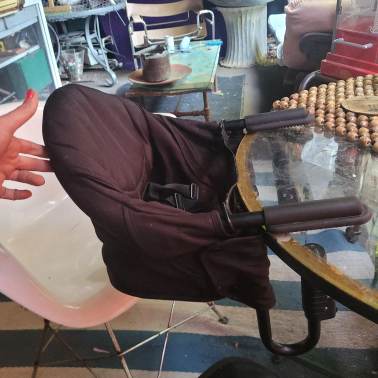 A great space saving option for the little one. High chair attaches to the table. Features a dark grey fabric. Comfortable design to securely hold your child.
