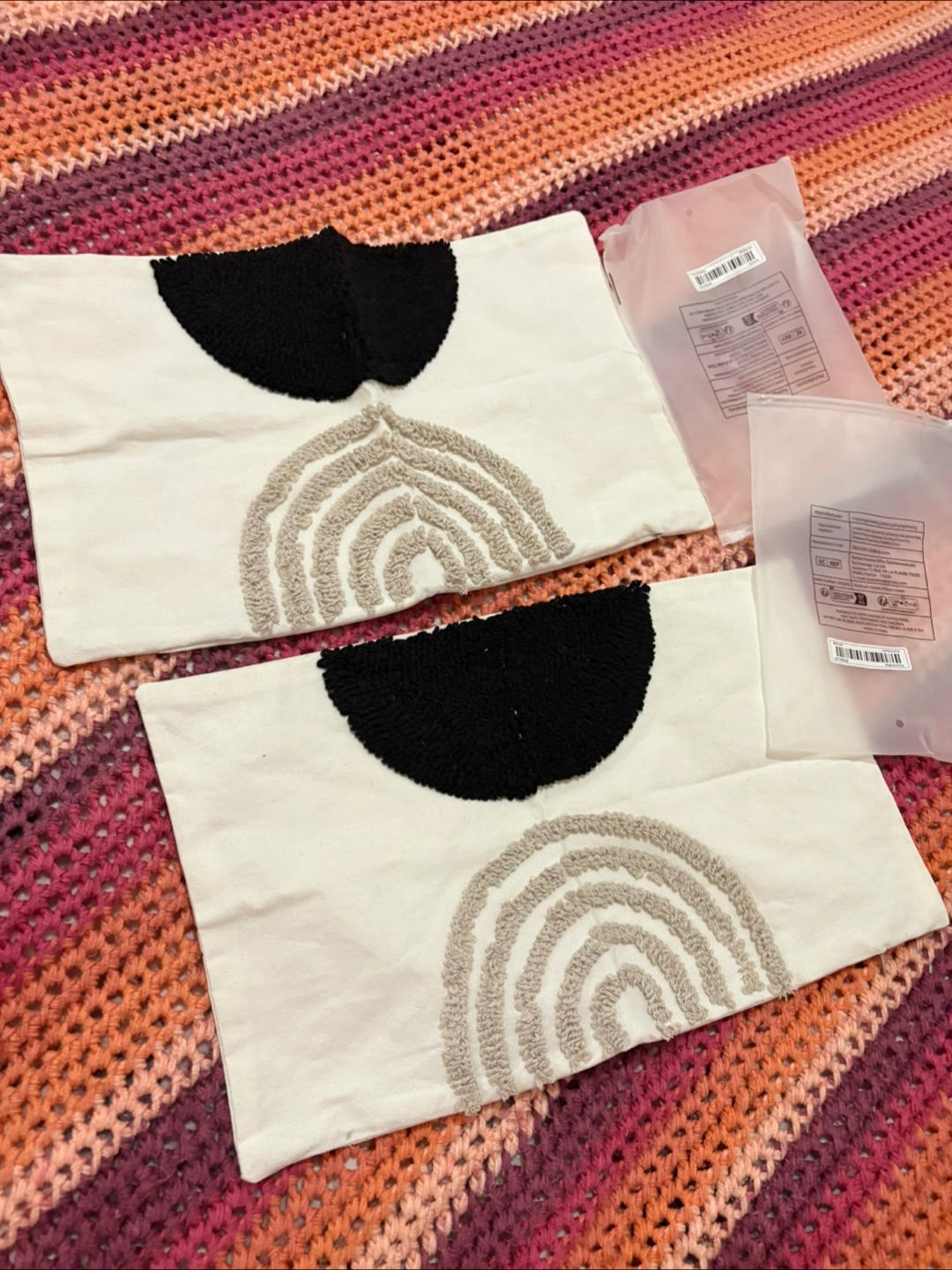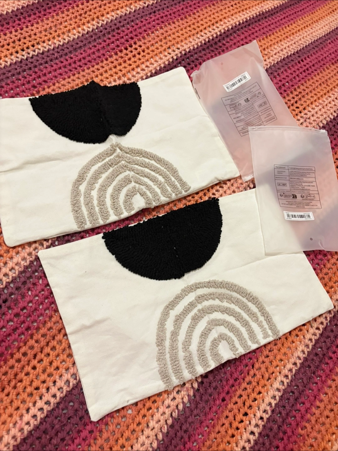 Brand new decorative throw pillows feature a cream base. They have unique textured designs. You can easily create a calming space with these. Included are the original packaging.