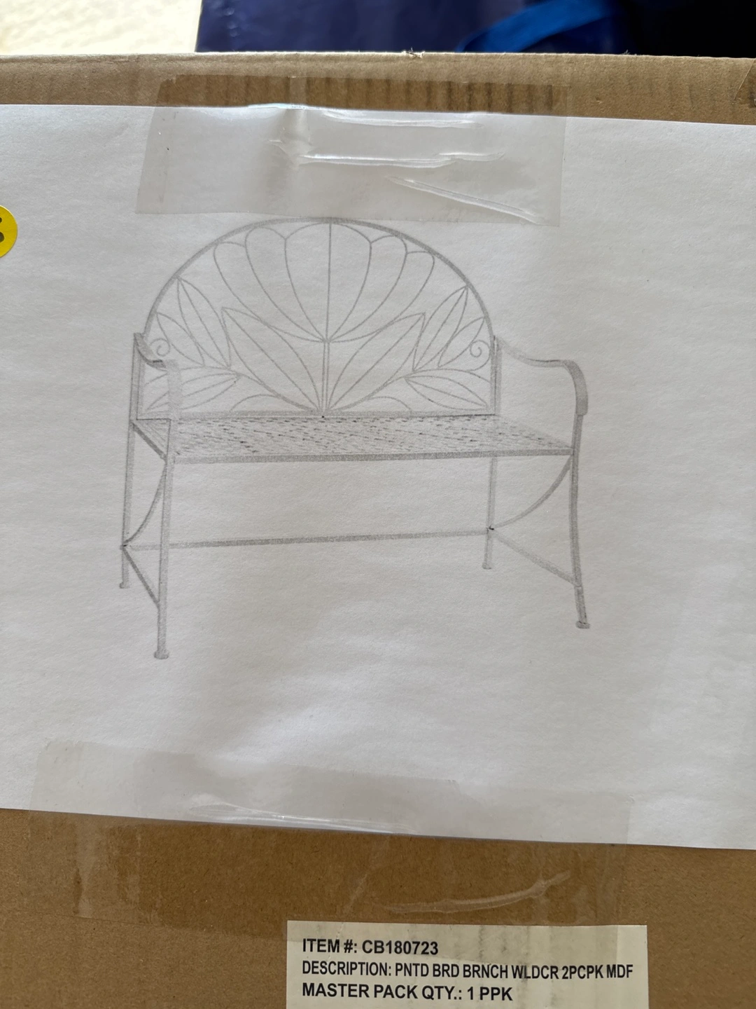 A metal bench featuring a decorative back and armrests. Likely used outdoors, the bench appears to be painted. Consider enjoying the sunset while seated on this comfortable bench.