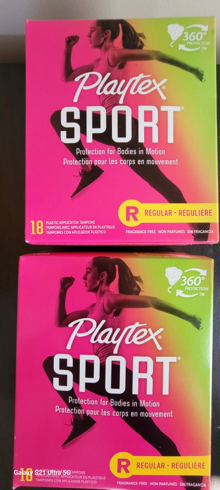 Boxes with Playtex Sport Regular tampons, with plastic applicators. They are fragrance-free. Consider these for a more confident day.