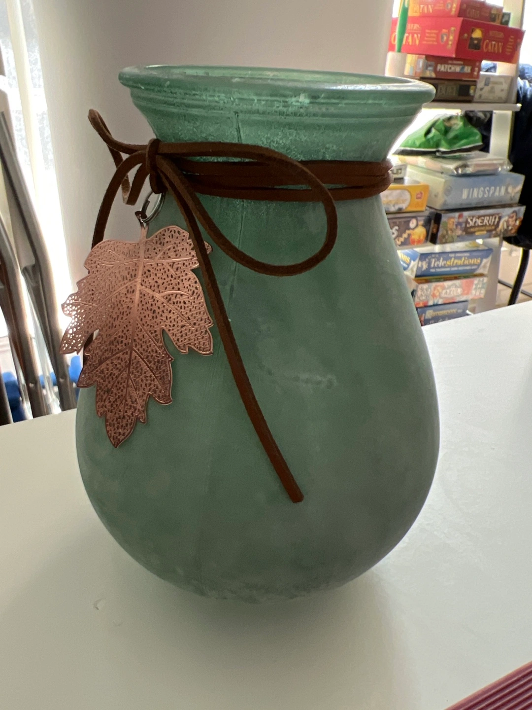 Cute little frosted green glass vase with copper leaf decoration. About 6 inches tall- perfect for decorating